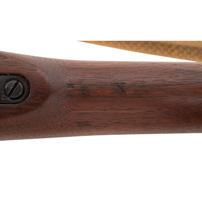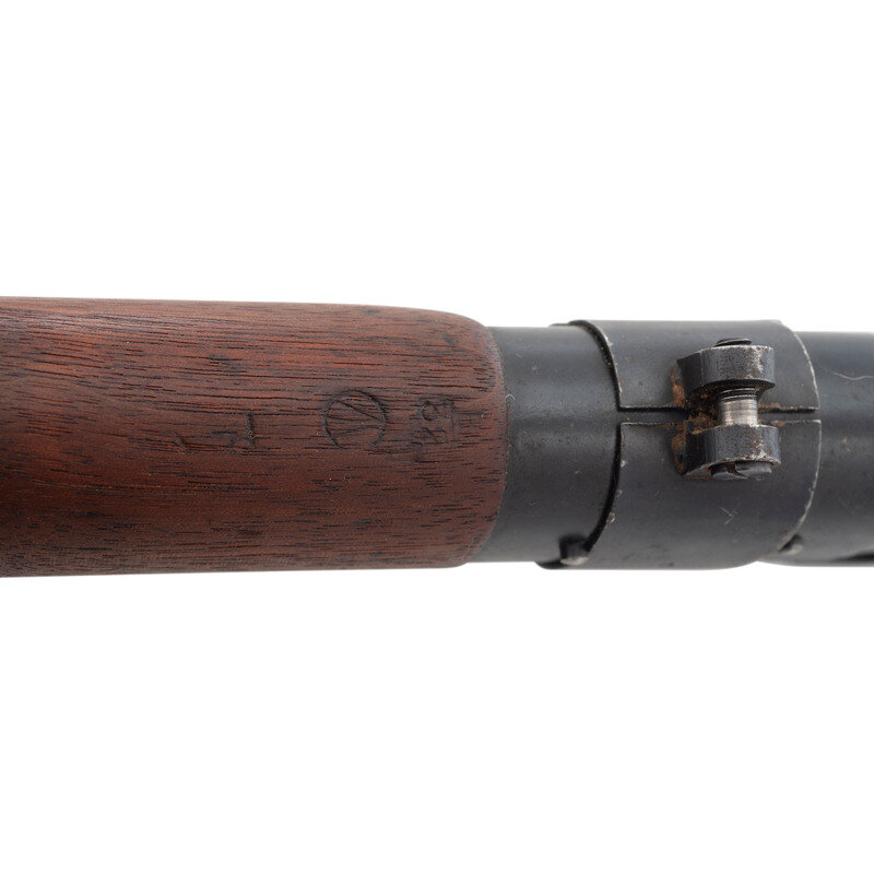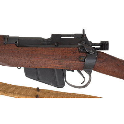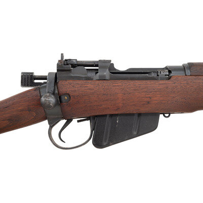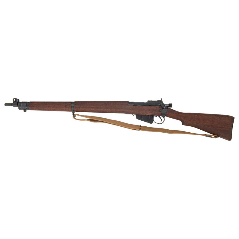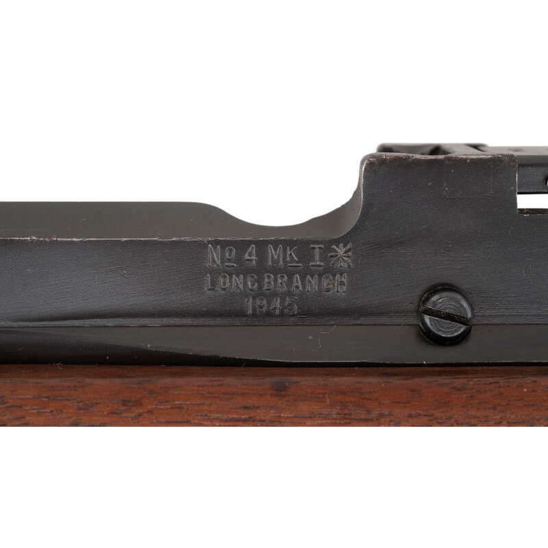 .303 British. 25" barrel length. SN: 89L3266. Blued military finish. Walnut stock has a plain semi pistol grip and forearm, with handguard. Bolt action rifle with MK III adjustable folding peep rear sight and adjustable blade front sight with ear protectors. Item features an integrated magazine, double sling swivels, and trapdoor buttplate void of contents. Markings include No 4/Mk I*/LONG BRANCH/1945 to left of receiver, and CAI importer marks also to left of muzzle. Includes a khaki sling.