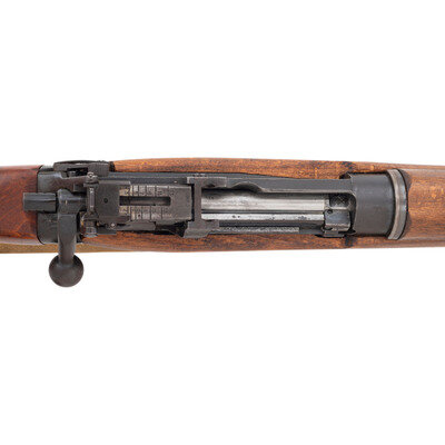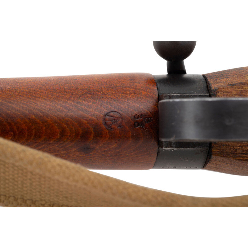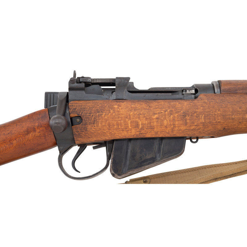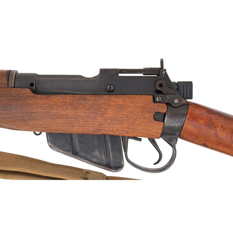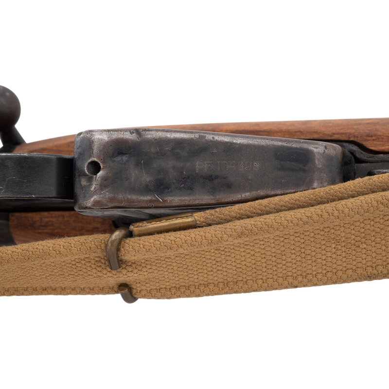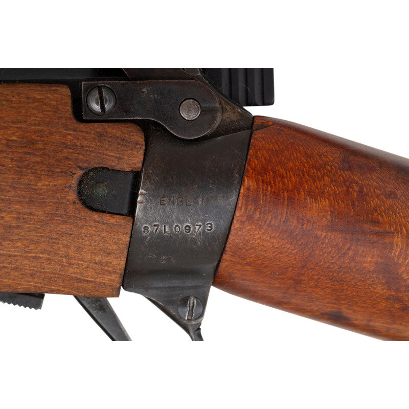 .303 British. 25" barrel length. SN: 87L0973. Blued military finish. Walnut stock has a plain semi pistol grip and forearm, with handguard. Bolt action rifle with MK3 adjustable folding peep rear sight and adjustable blade front sight with ear protectors. Item features an integrated magazine, double sling swivels, and a brass trapdoor buttplate void of contents. Markings include No 4/Mk I*/LONG BRANCH/1945 to left of receiver, as well as F.T.R./B marks also to left of receiver. Includes a khaki sling.