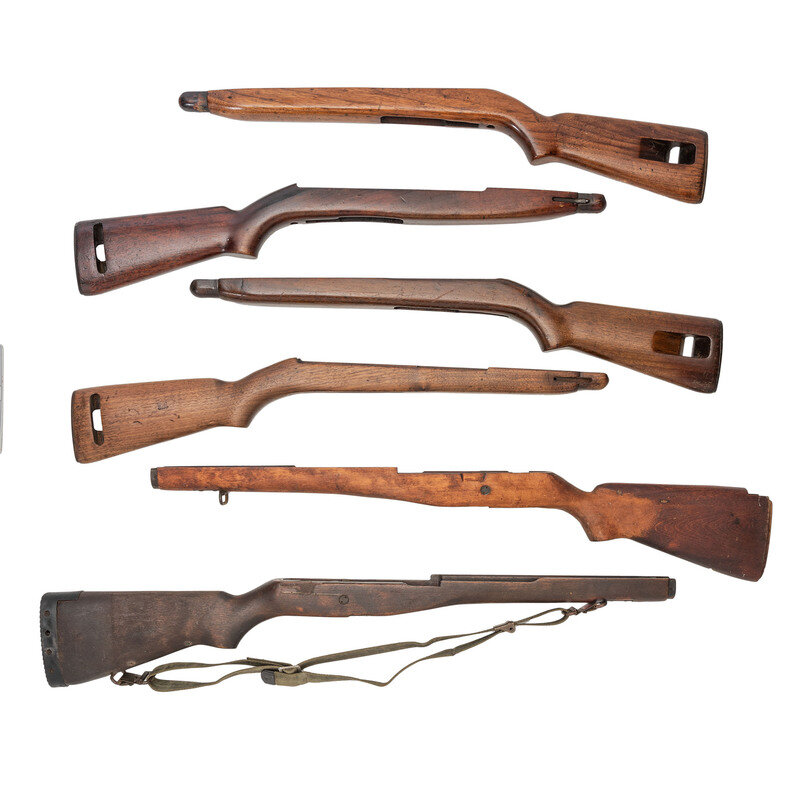 2.) Four U.S. M1 Carbine stocks, all with oval cutaways. Stocks are all unmarked except for one crossed cannons ordnance cartouche, and another with IO arsenal rebuild mark to sling cutaway.