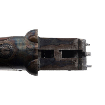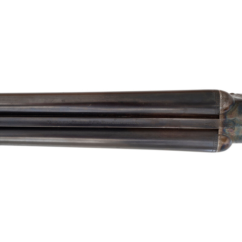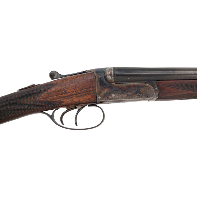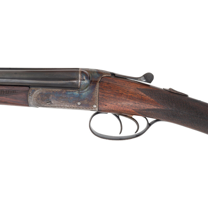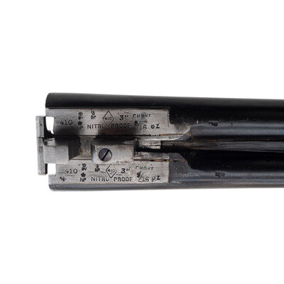 .410 gauge. 28" barrels with plain rib choked modified and modified. SN: NSN. Blued finish with color casehardened frame, checkered forend, checkered straight grip buttstock with checkered wood butt. Double barreled box lock shotgun with 3" chambers, automatic ejectors, sliding wrist mounted safety, double triggers, 14.125" length of pull, a 1.5" drop at comb and a 2.375" drop at the heel. Rib marked PARKER HALE LTD BIRMINGHAM. Box locks marked PARKER HALE LTD. Bottoms of barrels and water table with the usual array of Birmingham commercial proofs and markings. Receiver lightly engraved with foliate motifs. An unmarked oval German silver escutcheon is present in the toe line of the stock.