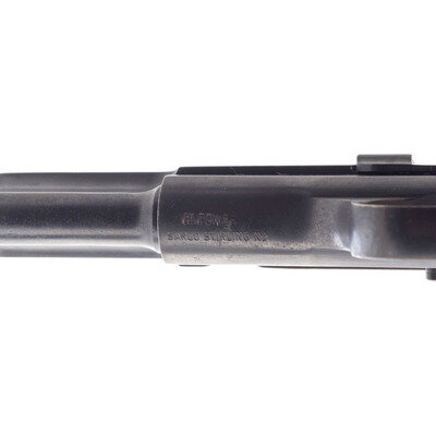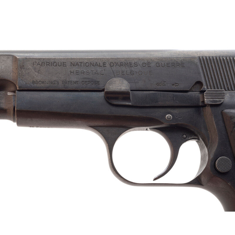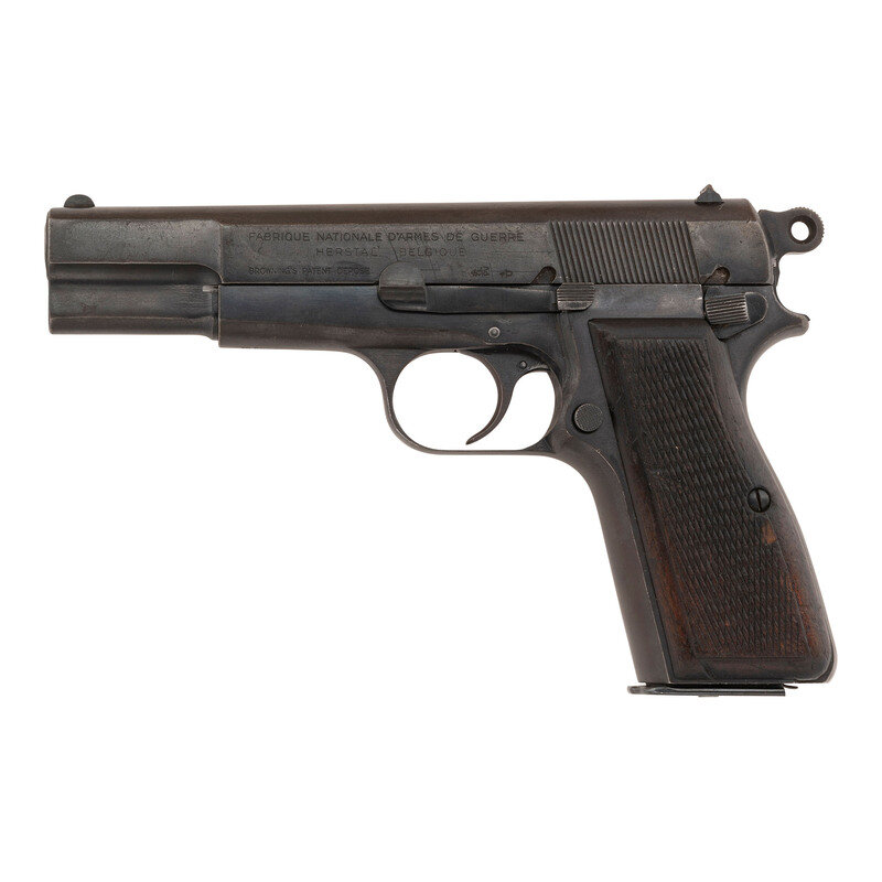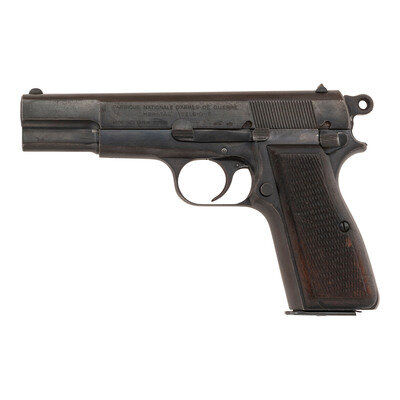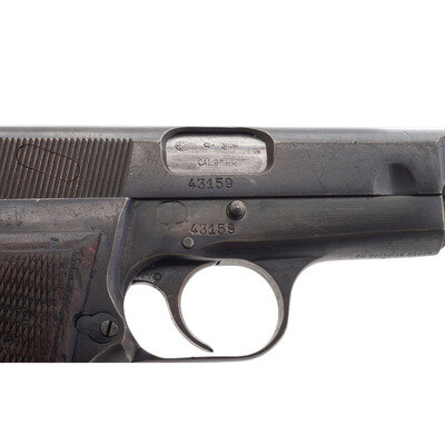 9mm Para. 4.7" barrel length. SN: 43159. Blued metal finish with polished barrel mounting checkered walnut stocks and fixed iron sights. Single action hammer-fired short recoil operated autoloading pistol fed by detachable double-stack magazines. Left slide is marked FABRIQUE NATIONALE D'ARMES DE GUERRE/HERSTAL BELGIQUE/BROWNING'S PATENT DEPOSE. Importer mark to the lower frame reads HI POWER/SARCO STIRLING, NJ. Serial numbers match on the frame, slide, and barrel. Belgian proof markings visible on the left slide, right barrel at breech, and left frame above the trigger guard. Comes with one modern production magazine.