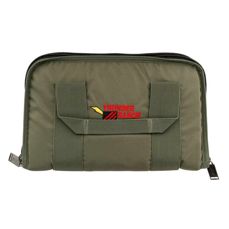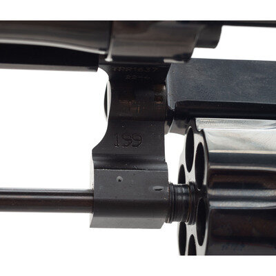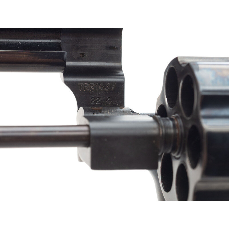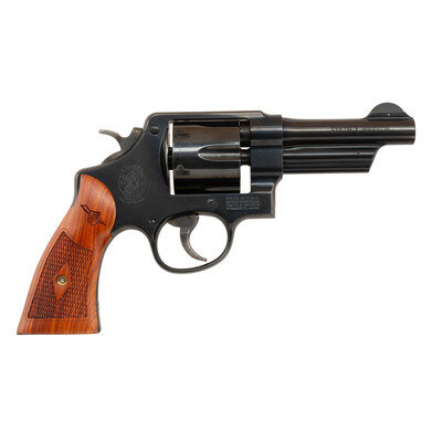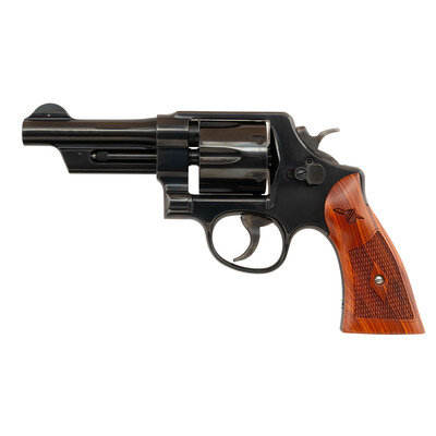 .45 ACP. 4" barrel length. SN: TRR1637. Blued metal finish with color case hardened hammer and trigger mounting checkered Cocobolo grips with {Thunder Ranch} logo. Double action hand ejector five-shot revolver mounting topstrap notch with pinned half-moon front blade sights in a four screw frame with lock. Revolver is marked 45 CAL. MODEL 1950 to the left barrel and SMITH & WESSON to the right. The monogram trade mark is struck into the sideplate with the four-line address appearing on the right frame. Item comes in a green synthetic soft case with THUNDER RANCH logo inside of a white cardboard shipping box. Included in the box are a packet of five full moon clips, two internal safety lock keys, owner's manual with inserts, and an unopened cable lock in package.