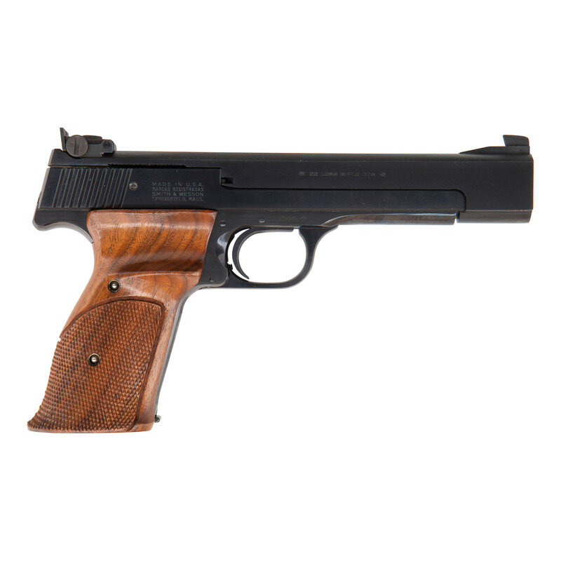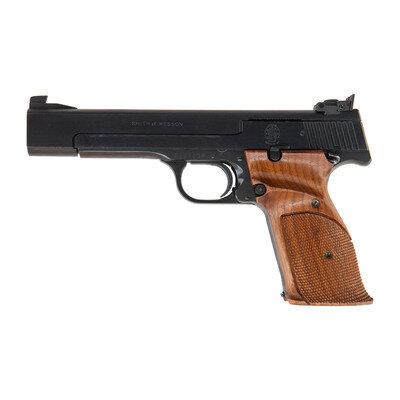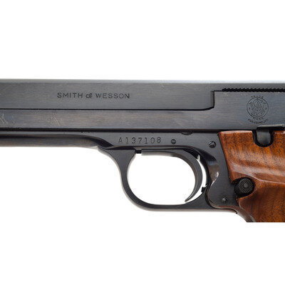 .22 LR. 5.5" barrel length. SN: A137108. Blued metal finish mounting checkered walnut target stocks with thumb and finger rests. Striker action simple blowback operated autoloading pistol fed by detachable single stack magazines. Item mounts fully adjustable target rear and Patridge front sights with a matted barrel rib. Markings include MODEL 41 to the right frame, and standard make and model markings overall. Comes in a matching blue cardboard box with one magazine and the owner's manual.