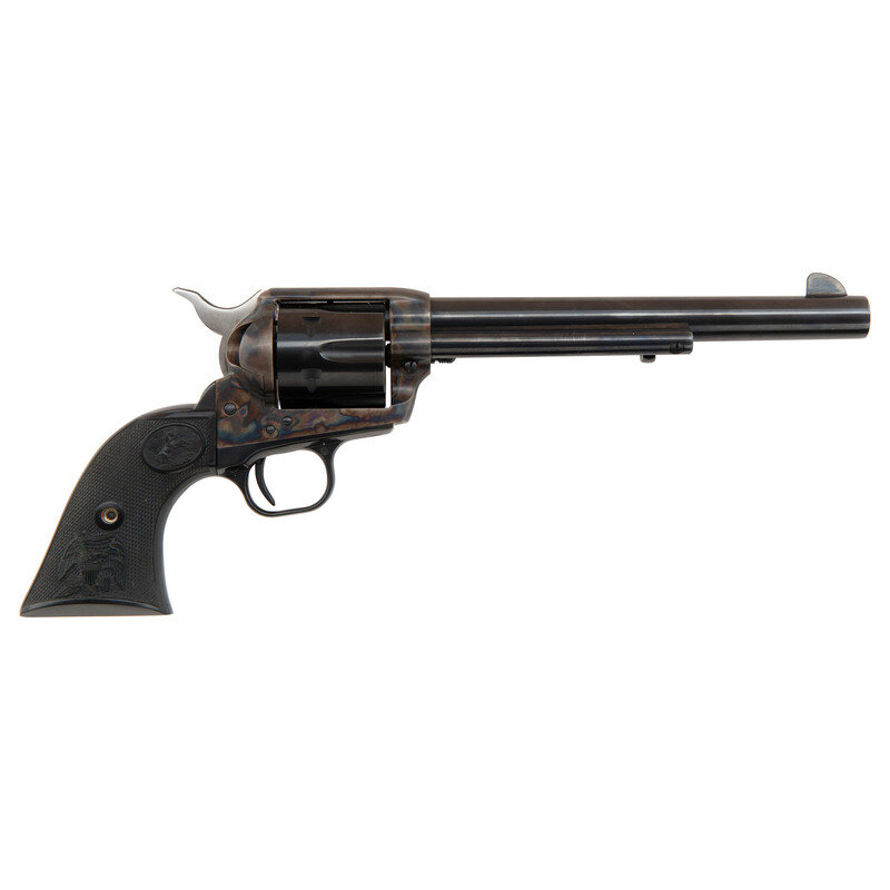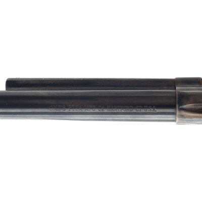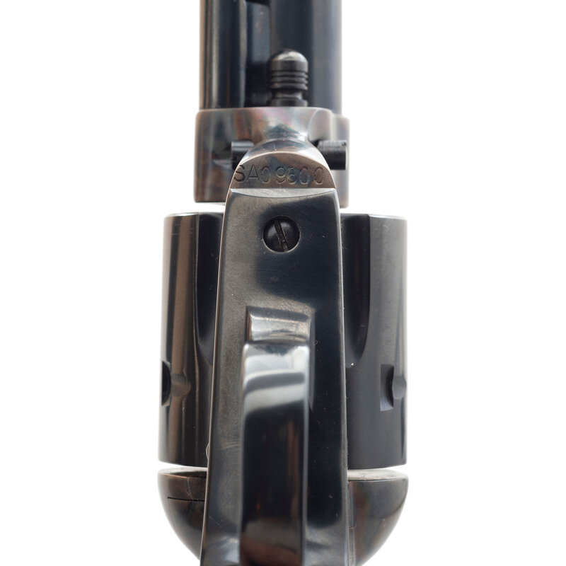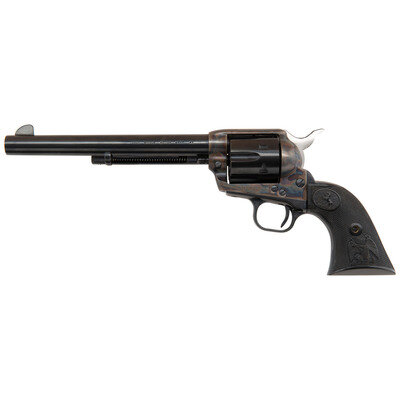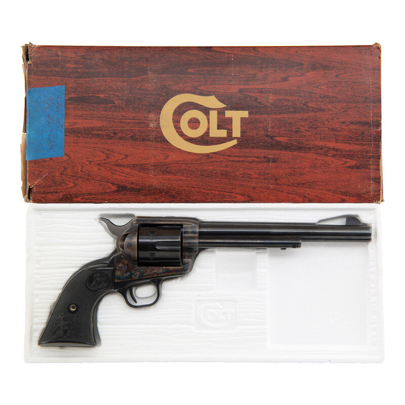 .45 Long Colt. 7.5" barrel length. SN: SA09600. Blued metal finish with casehardened fame and polished hammer flanks mounting black synthetic Colt Eagle grips. Single-action loading gate six-shot revolver featuring kidney-shaped ejector rod head on a smokeless powder frame. Sights consist of a topstrap notch and fixed front blade. The left frame is struck with the standard two-line patent and {Rampant Colt} logo with Colt's VP monogram proof appearing on the triggerguard below the patent marks. Left barrel features the model marking COLT SINGLE ACTION ARMY .45 with the top struck with the single-line address COLT'S PT. F.A. MFG. CO. HARTFORD CT. U.S.A. Item comes in its original wood print pattern cardboard box with the owner's manual and flyers.