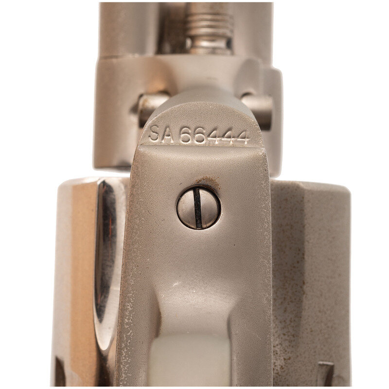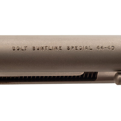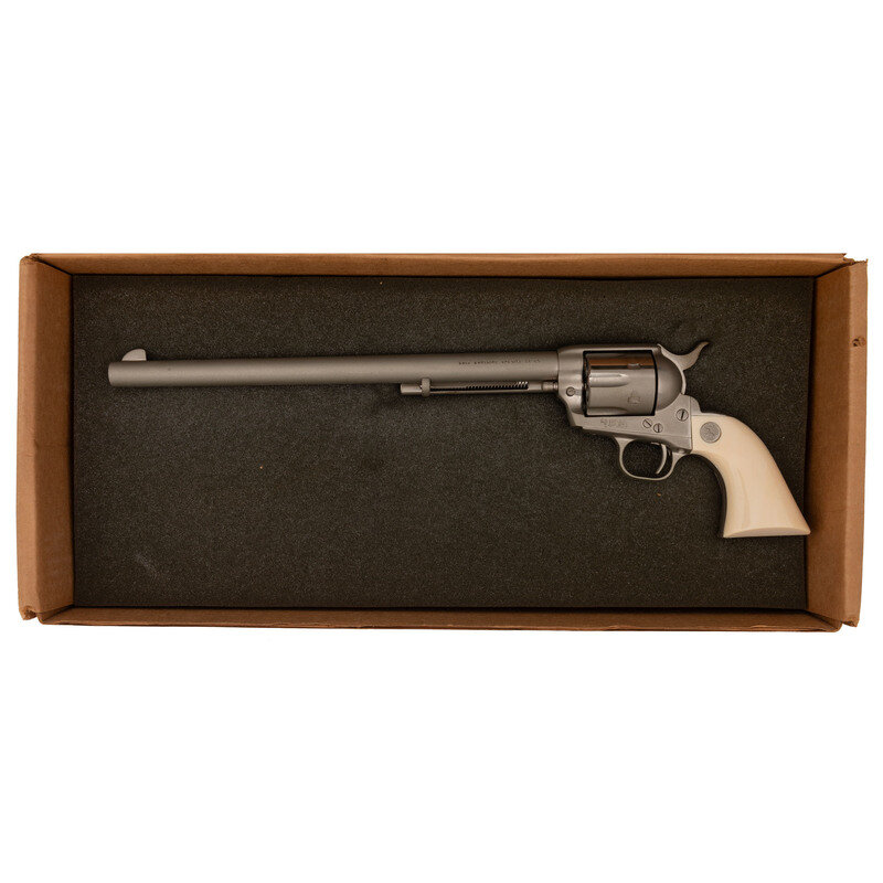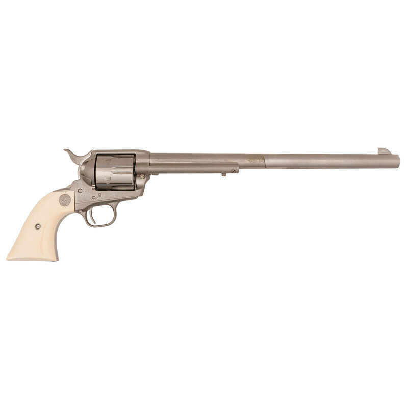 .44-40. 12" barrel. SN: SA66444. Full nickel finish, two-piece faux ivory Rampant Colt medallion grips. Single action solid frame revolver with loading gate and six-chambered fluted cylinder. Period style one-line Hartford barrel address and three-date in three-line patent markings on lower left of frame. Traditional frame notch rear sight and fixed blade front sight and kidney shaped ejector rod head. Production of these Buntlines was fairly low, estimated at less than 200 circa 1984-1985. Revolver is in what appears to be the factory cardboard box with no label, foam interior and the factory paperwork.