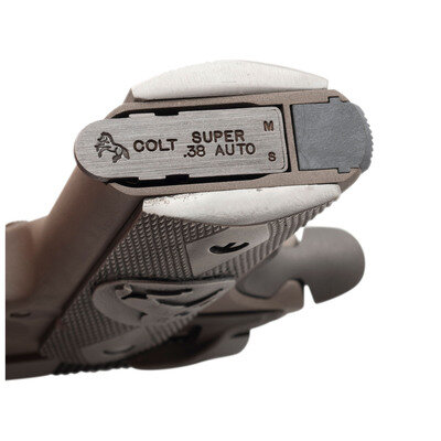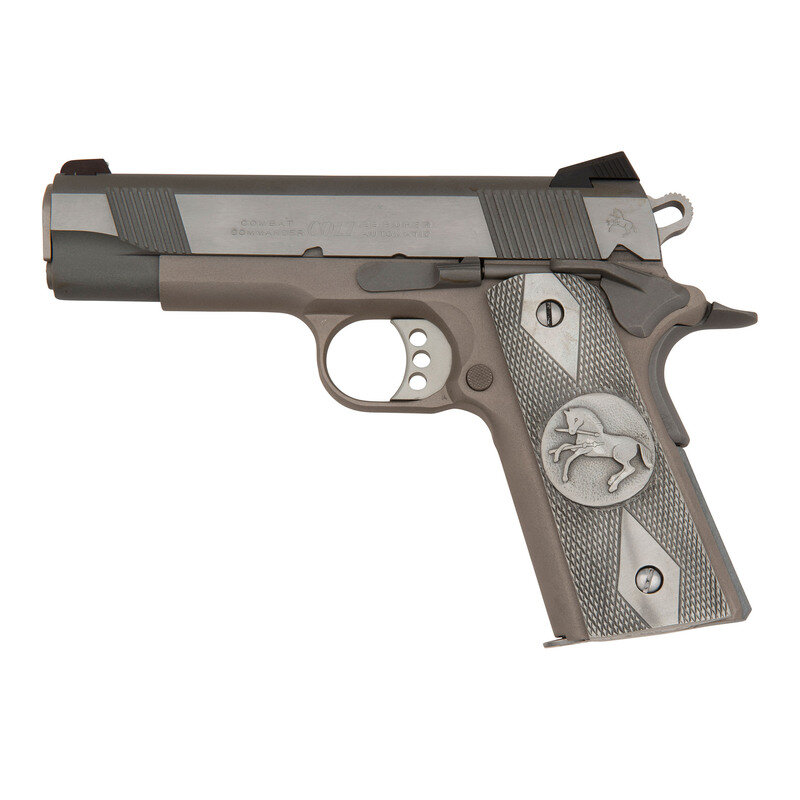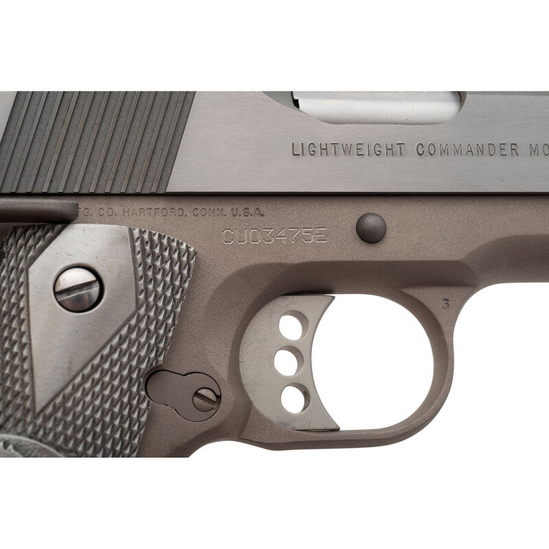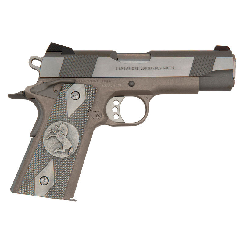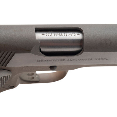 .38 Super. 4.25" barrel length. SN: CU03475E. Brushed stainless steel finish with Teflon coated aluminum frame mounting cast aluminum Diamond checkered grips with prominent {Rampant Colt} logos. Single action short-recoil operated autoloading pistol fed by detachable single stack magazines. Item mounts an ambidexterous safety lever, high cut frame, front and rear cocking serrations, and triple dot carry sights. Comes in its original cardboard box with one magazine, the owner's manual with inserts, feature guide to this model, and a cable lock in its package. Markings overall are standard for the Colt Combat Commander with right slide struck LIGHTWEIGHT COMMANDER MODEL.
