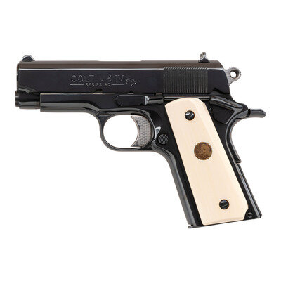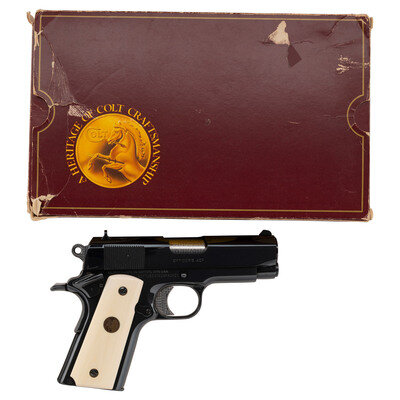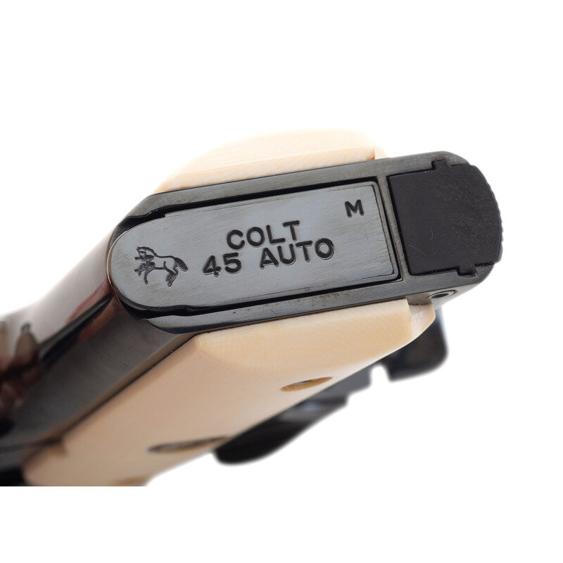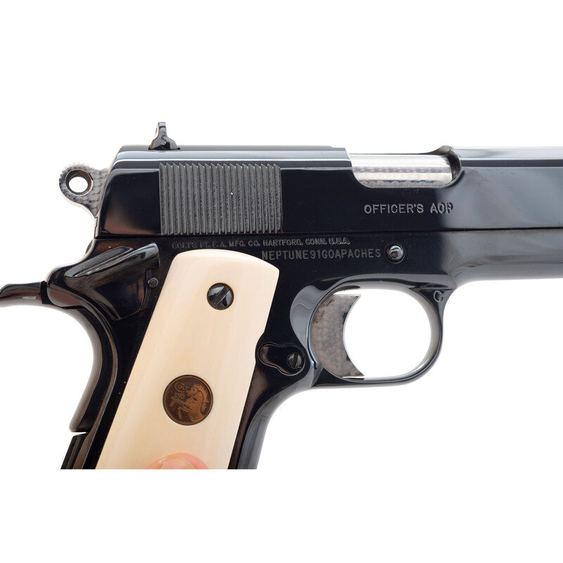 .45 ACP. 3.5" Barrel. SN: NEPTUNE91GOAPAHCES. Royal Blue finish, bright jeweled trigger, hammer and chamber, synthetic ivory grips with gold Rampant Colt 150 Anniversary medallions. Single action, tilting barrel, Browning designed magazine-fed semi-automatic pistol. Standard Colt MKIV Series 80 markings on slide. Special order Custom Shop serial number. Flat mainspring housing, ambidextrous thumb safety, grip safety, fixed three dot sights. Includes a single 6-round magazine and the original Colt Factory box that notes the custom serial number. Although the box describes the finish as "MATTE" the custom serial number indicates the work, including the royal blue finish and jeweled small parts were done at Colt. A lovely Colt Officer's sized 1911 that was likely custom ordered for a US Military Special Operator with the serial number possibly a reference to Team Neptune which was put together for the Neptune Spear operation which was the raid against the Osama Bin Laden compound in Pakistan. Interestingly the call sign "Geronimo" was assigned to Bin Laden, which may explain the "Go Apaches" part of the serial number.
