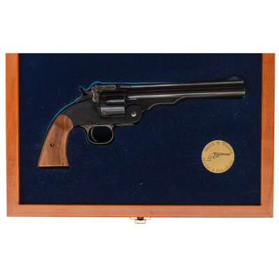 .45 S&W Schofield. 7" ribbed barrel. SN: GWS0904. Blued and color casehardened finish, smooth two-piece hardwood grips. Single action top break, simultaneous extraction revolver with six-chambered fluted cylinder. Smith & Wesson's Performance Center recreation of the US Model 1875 2nd Model Schofield Cavalry Revolver, with a frame mounted, rather than hammer mounted firing pin to add safety and reduce the possibility of an accidental discharge if dropped. The revolver features a recreation of the markings similar to those found on an original period Schofield revolver, including a script cartouche on the left grip and the "US" marking on the butt. Fixed notch rear sight in top of barrel catch and pinned rounded blade front sight, as found on the original revolvers. The revolver includes its factory wooden Performance Center box with form fit foam interior, original paperwork and key for the case.