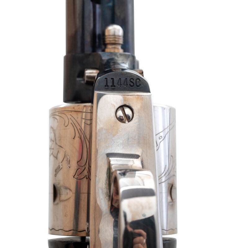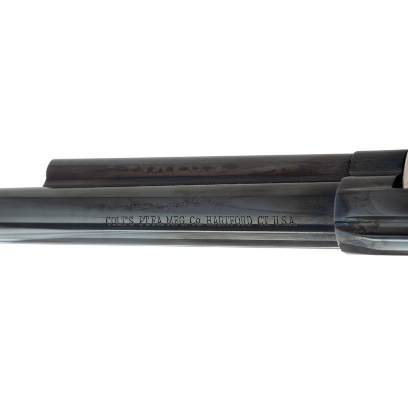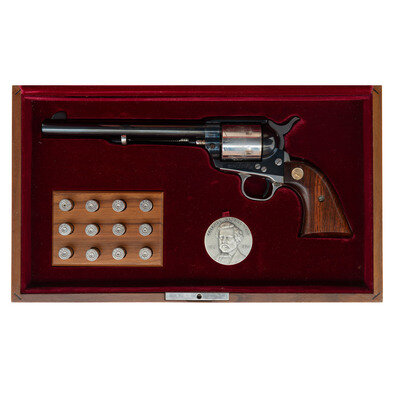 .45 Colt. 7.5" barrel. SN: 1144SC. Blued barrel and frame, plated cylinder, triggerguard, back strap and hammer, smooth two-piece figured hardwood grips with Rampant Colt medallions. Single action smokeless powder frame revolver with loading gate, frame notch rear sight, blade front sight and six-chambered fluted cylinder. One line Hartford barrel address. Left side of barrel roll marked 1814 - COL SAML COLT SESQUICENTENNIAL MODEL - 1964. The revolver is contained in the wooden Colt factory display box with a fitted crushed burgundy velvet lining. The box includes 12 dummy .45 Colt cartridges, a commemorative medallion and a copy of R.L. Wilson's book The Arms Collection of Colonel Colt. Only 4,750 of these revolvers were produced in 1964 with an issue price of $225, equivalent to roughly $2,200 adjusted for inflation.