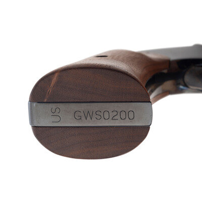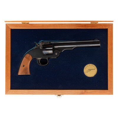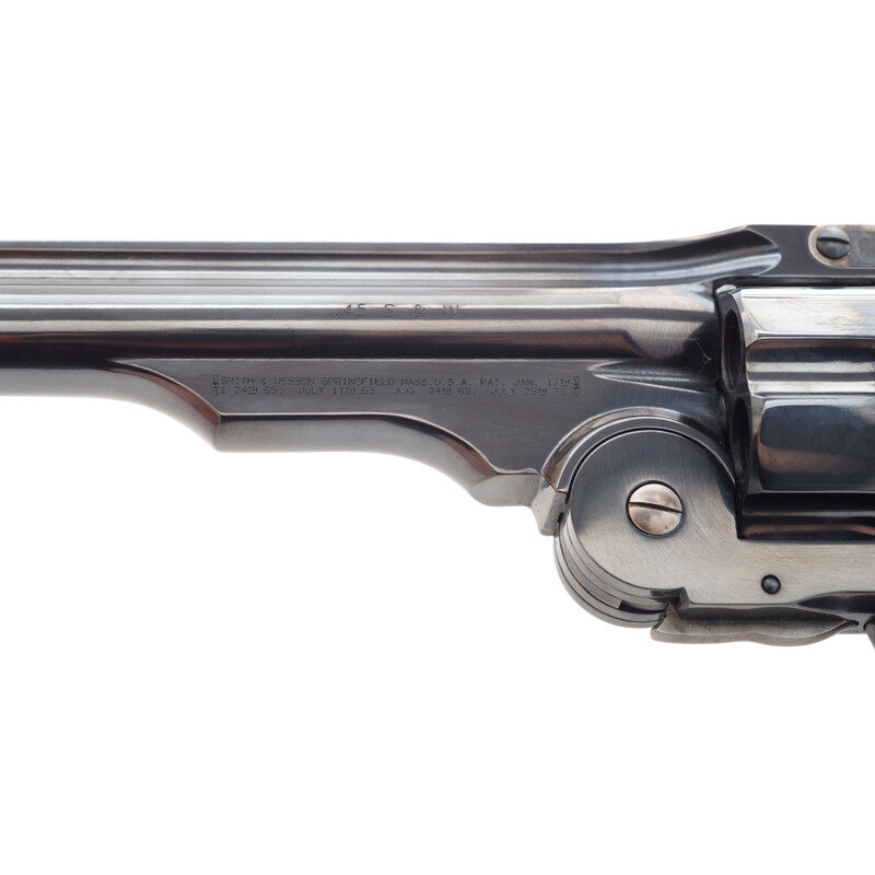 .45 S&W Schofield. 7" ribbed barrel. SN: GWS0200. Blued and color casehardened finish, smooth two-piece hardwood grips. Single action top break, simultaneous extraction revolver with six-chambered fluted cylinder. Smith & Wesson's Performance Center recreation of the US Model 1875 2nd Model Schofield Cavalry Revolver, with a frame mounted, rather than hammer mounted firing pin to add safety and reduce the possibility of an accidental discharge if dropped. The revolver features a recreation of the markings similar to those found on an original period Schofield revolver, including a script cartouche on the left grip and the "US" marking on the butt. Fixed notch rear sight in top of barrel catch and pinned
