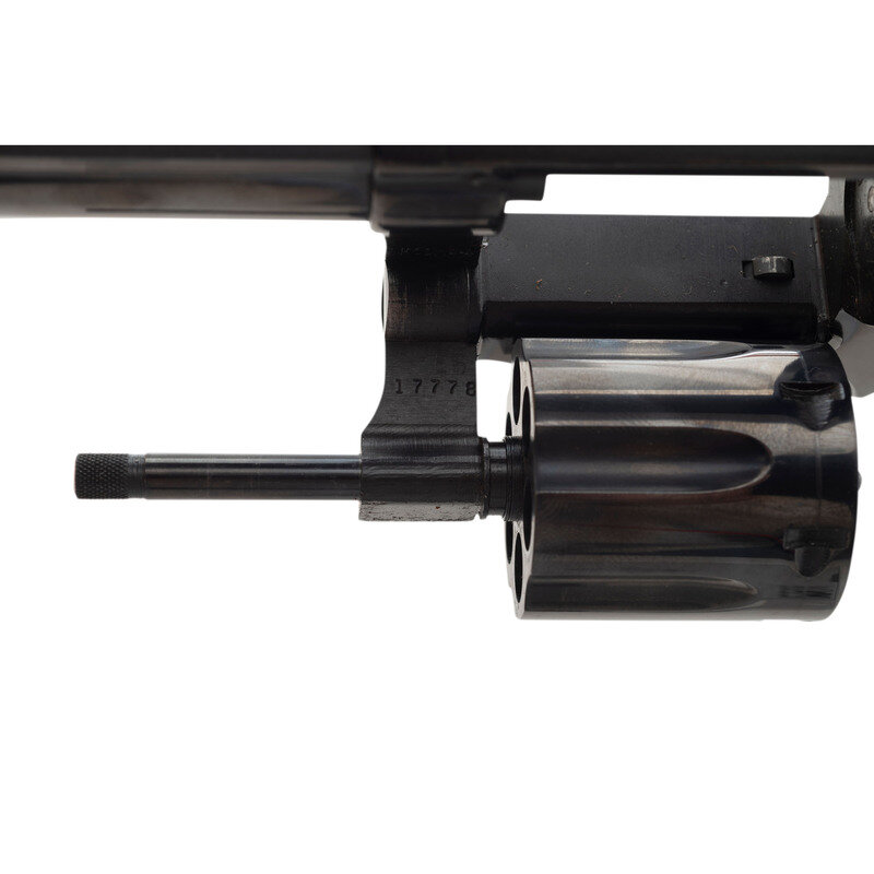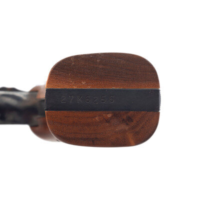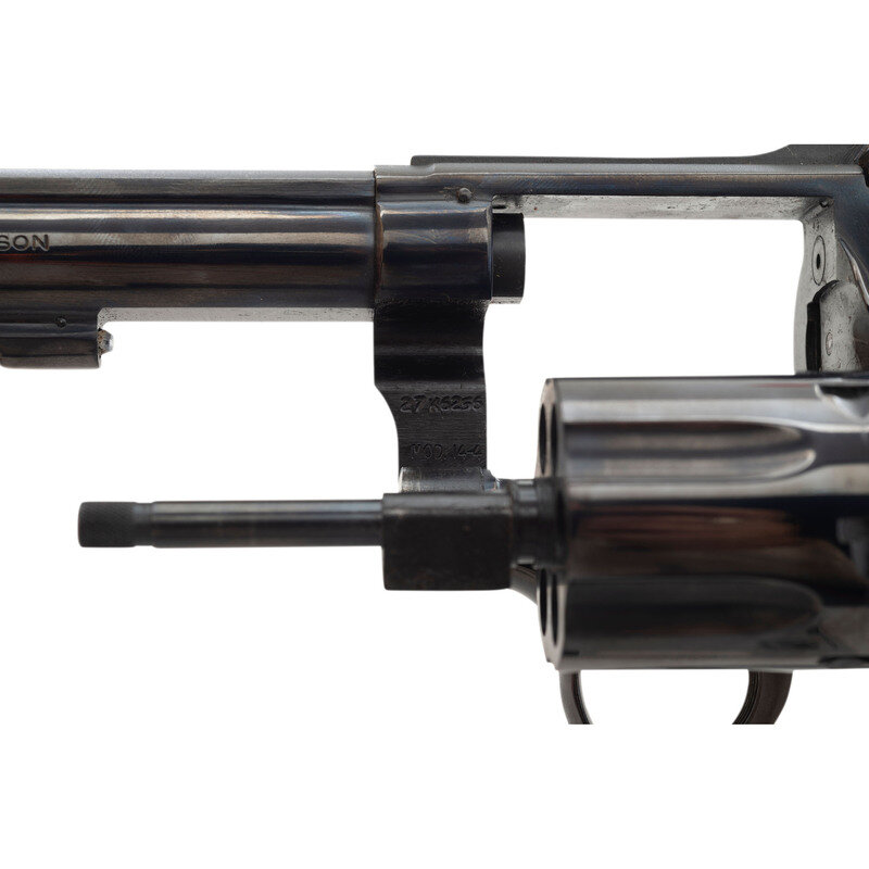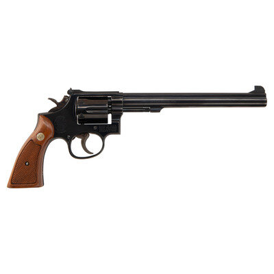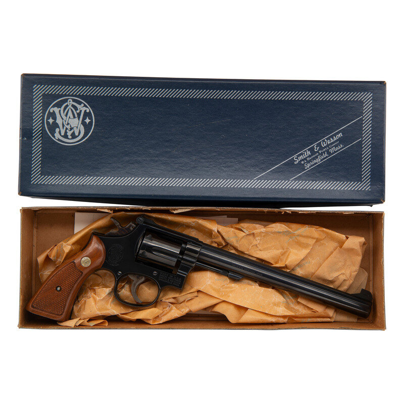 .38 Special. 8.375" barrel length. SN: 27K6256. Blued metal finish with color case hardened hammer and trigger mounting checkered walnut Smith & Wesson medallion grips. Double action hand ejector six-shot revolver featuring a pinned barrel on a three screw frame. Sights consist of an adjustable rear target and Patridge front blade atop a matted barrel rib. Standard make and model markings include the four-line address to the right frame and monogram trade mark to the sideplate. Item comes in its original blue cardboard box with the owner's manual and cleaning kit.