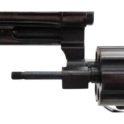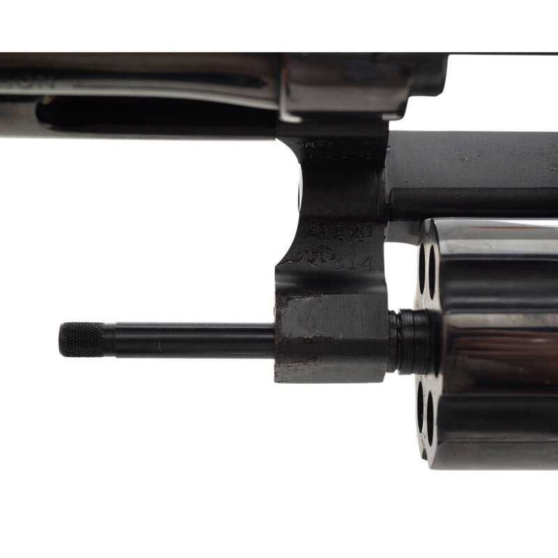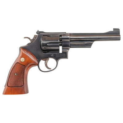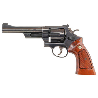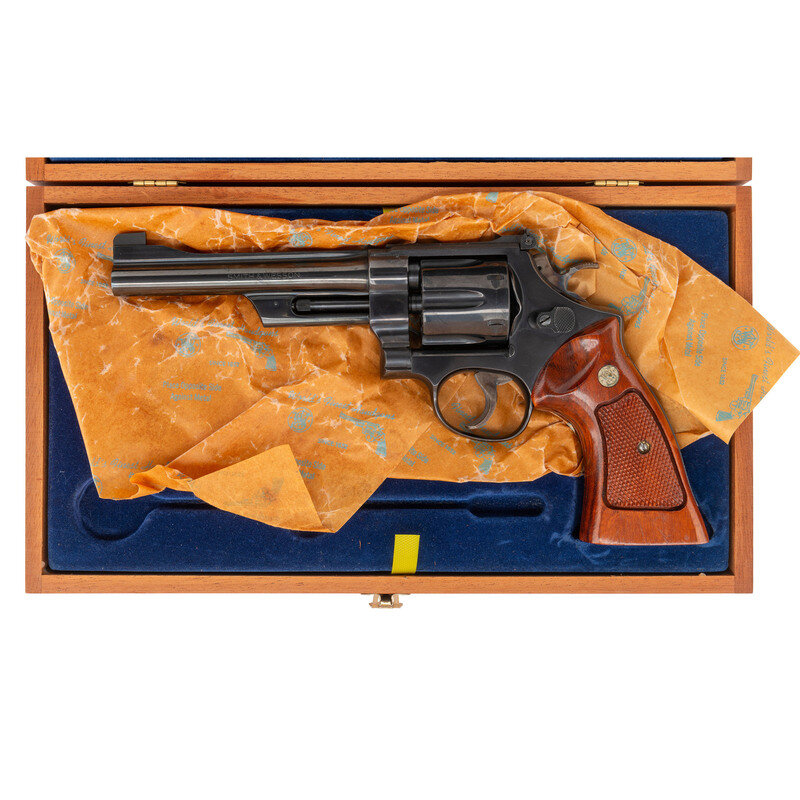 .357 Magnum. 6" barrel with finely checkered matted rib. SN: N360077. Blued finish, color casehardened hammer and trigger, oversized two-piece checkered hardwood target grips with Smith & Wesson medallions. Double action swing out fluted cylinder revolver with six chambers, shrouded ejector, wide grooved trigger, wide checkered hammer, adjustable rear sight without white outline and a ramped semi-Patridge front sight. Standard Smith & Wesson markings. Revolver is contained in a wood display case with fitted blue flocked plastic insert interior and includes a cleaning rod, bore brush, bore mop and screwdriver.