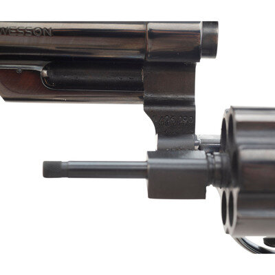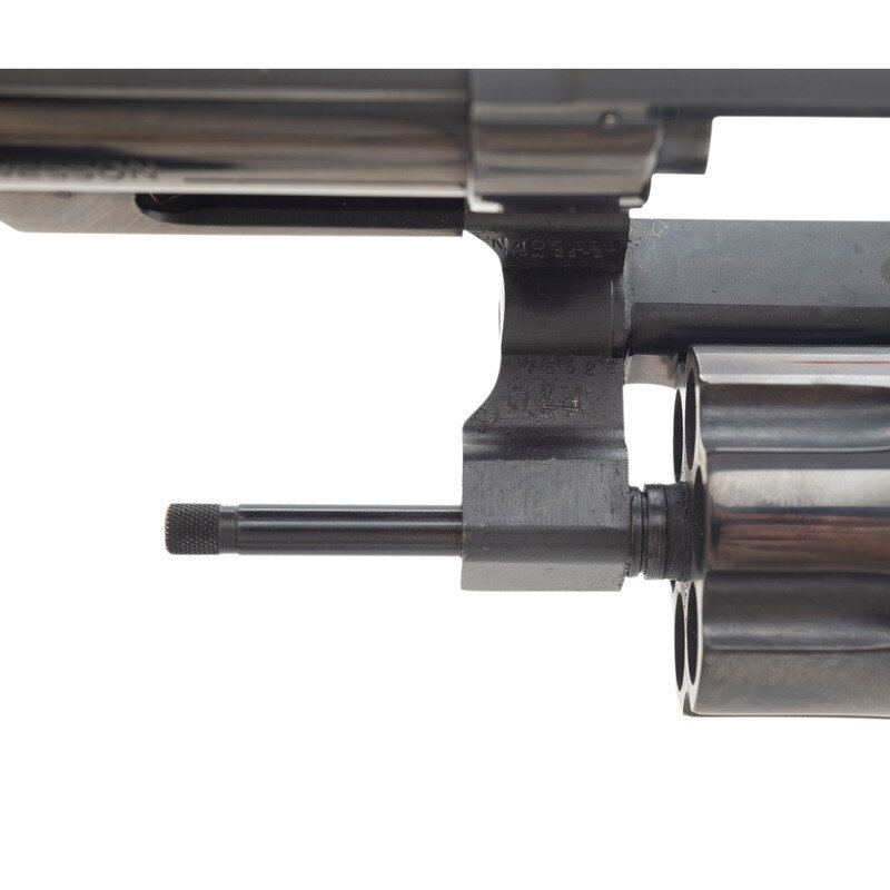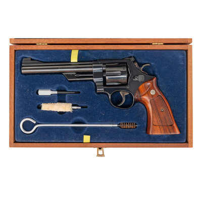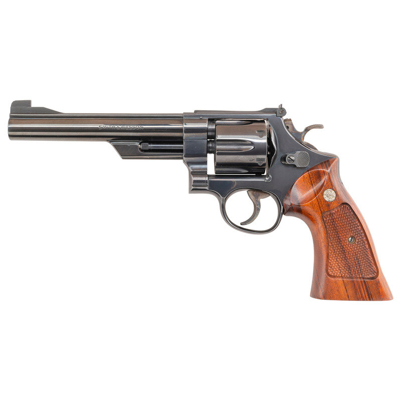 .45 ACP. 6.375" barrel length. SN: N406090. Blued metal finish with casehardened hammer and trigger mounting Smith & Wesson medallion checkered Goncalo Alves grips. Double action six-shot hand ejector revolver mounting fully adjustable white outline rear notch and Patridge front sights on a matted barrel rib. Revolver features a pinned barrel and non-recessed cylinder on a three screw frame. Markings include MOD. 25-2 to the inner frame with standard make and caliber markings overall. Comes in a wood case with flocked blue interior and accessories including: cleaning kit, owner's manual, and ad inserts.
