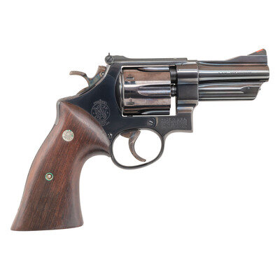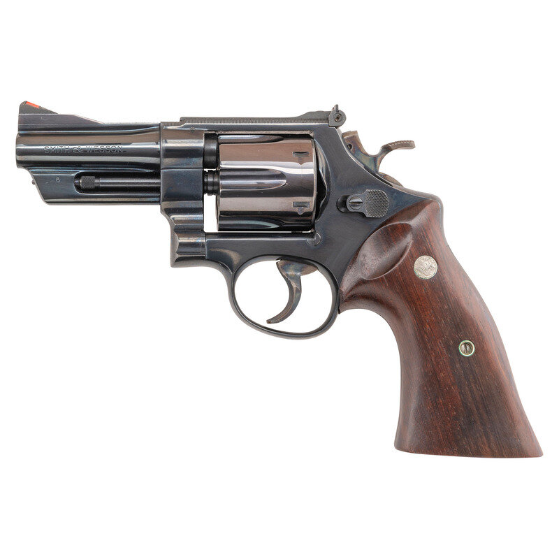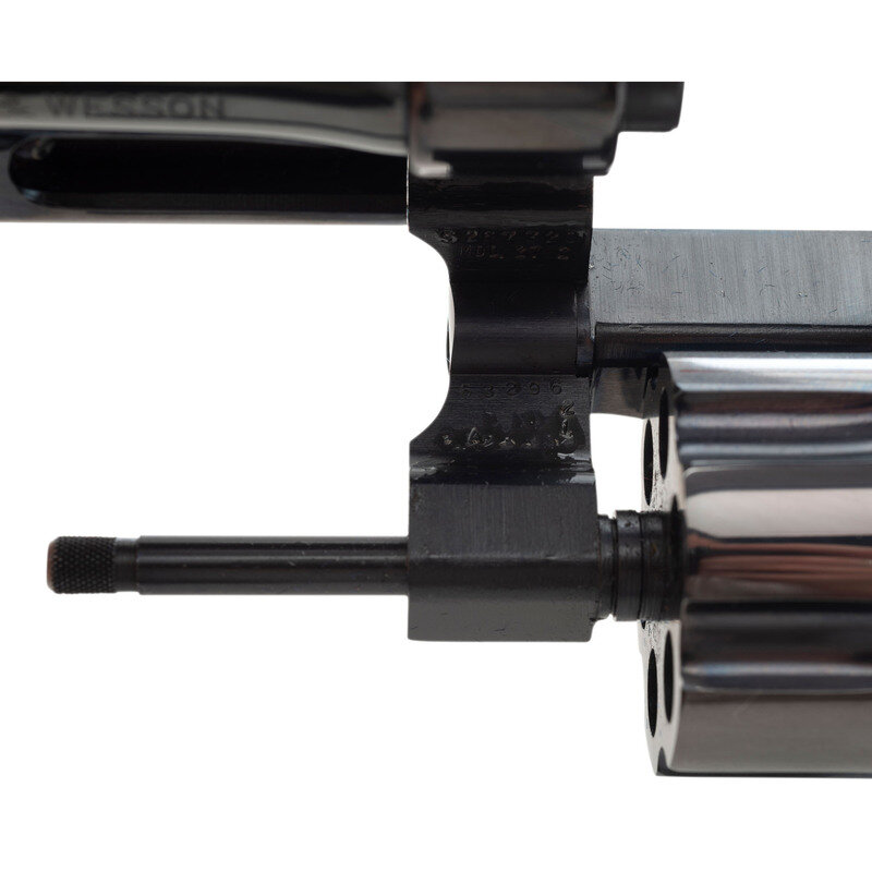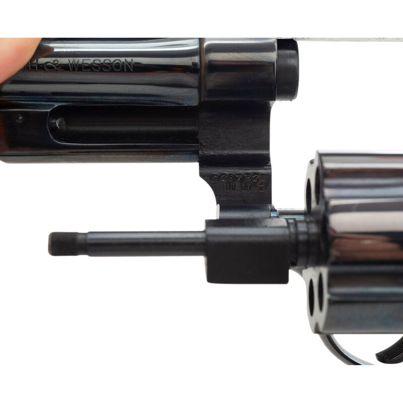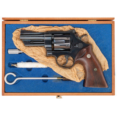 .357 Magnum. 3.5" barrel length. SN: S267320. Blued metal finish with casehardened hammer and trigger mounting smooth walnut Smith & Wesson medallion grips. Double action hand ejector revolver featuring a pinned barrel and recessed cylinder on a three screw frame. Sights consist of a white outline adjustable rear notch, and a matted front Baughman Quick Draw sight with red plastic insert. Markings include MOD. 27-2 to the inner frame and four-line address to the right with standard maker and caliber markings. Comes in a wood box with blue flocked lining containing an aluminum cleaning rod, bore mop, bore brush, and screwdriver.