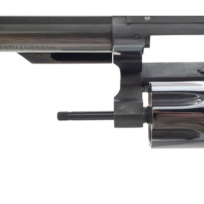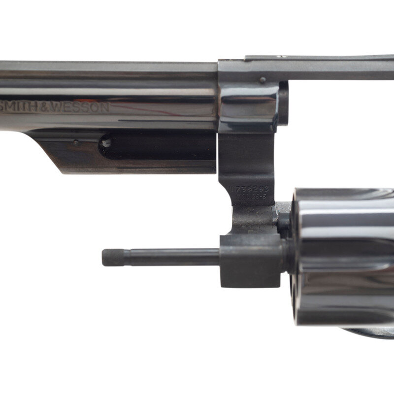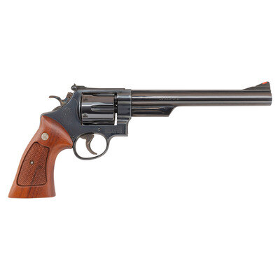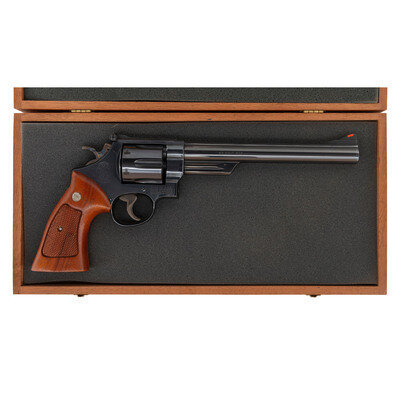 .45 Colt. 8.375" barrel with matted rib. SN: N735293. Blued finish, color casehardened hammer and trigger, oversized two-piece checkered hardwood target grips with Smith & Wesson medallions. Double action swing out fluted cylinder revolver with six chambers, shrouded ejector, wide grooved trigger, wide checkered hammer, adjustable rear sight with white outline and a ramped front sight with orange insert. Standard Smith & Wesson markings. Revolver is contained in a non-factory wood display box with a simple foam interior.