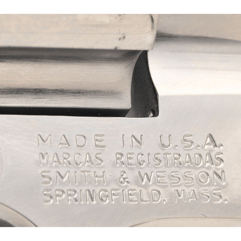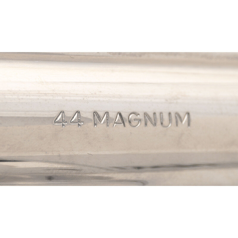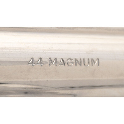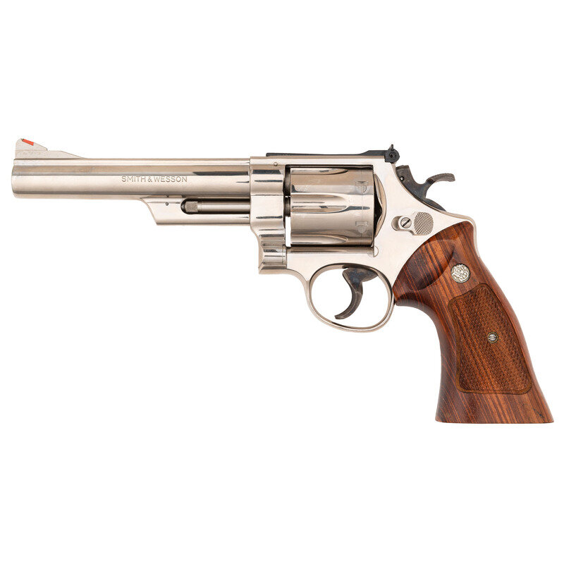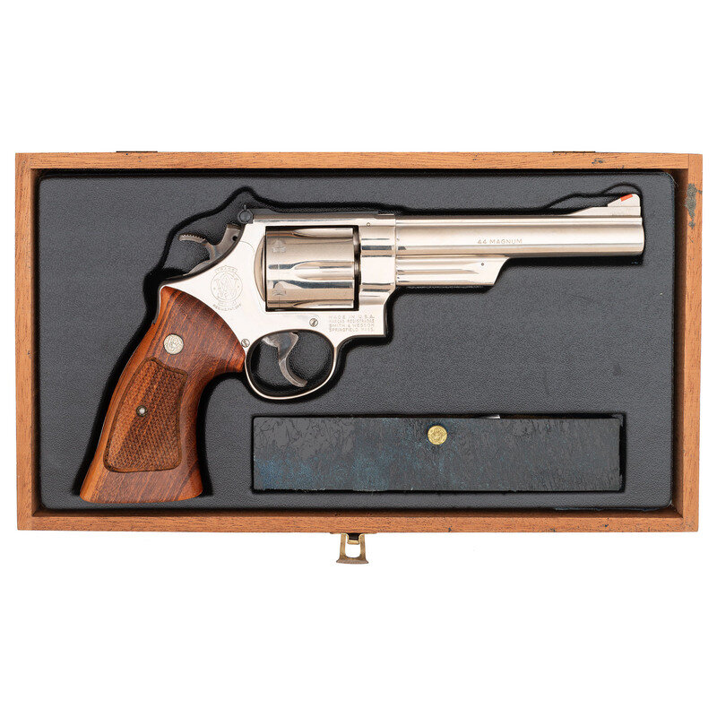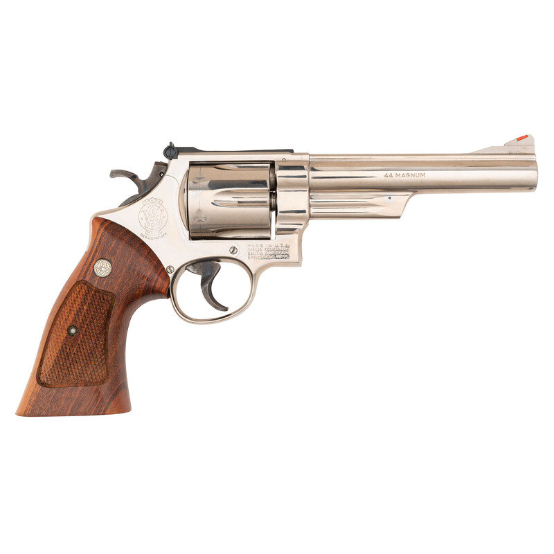 .44 Magnum. 5.875" barrel length. SN: N745370. Nickel plated finish overall with casehardened hammer and trigger mounting checkered Smith & Wesson medallion Goncalo Alves grips. Double action six-shot hand ejector revolver mounting adjustable target rear and red plastic insert Baughman Quick Draw sights. Item features a pinned barrel and recessed cylinder on a three screw frame, along with a wide target hammer and trigger. Standard make and model markings appear overall. Comes in a wood presentation case with flocked blue lining to the interior and an aluminum cleaning rod.