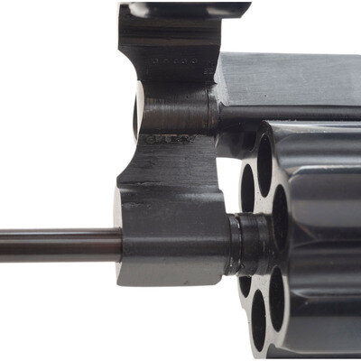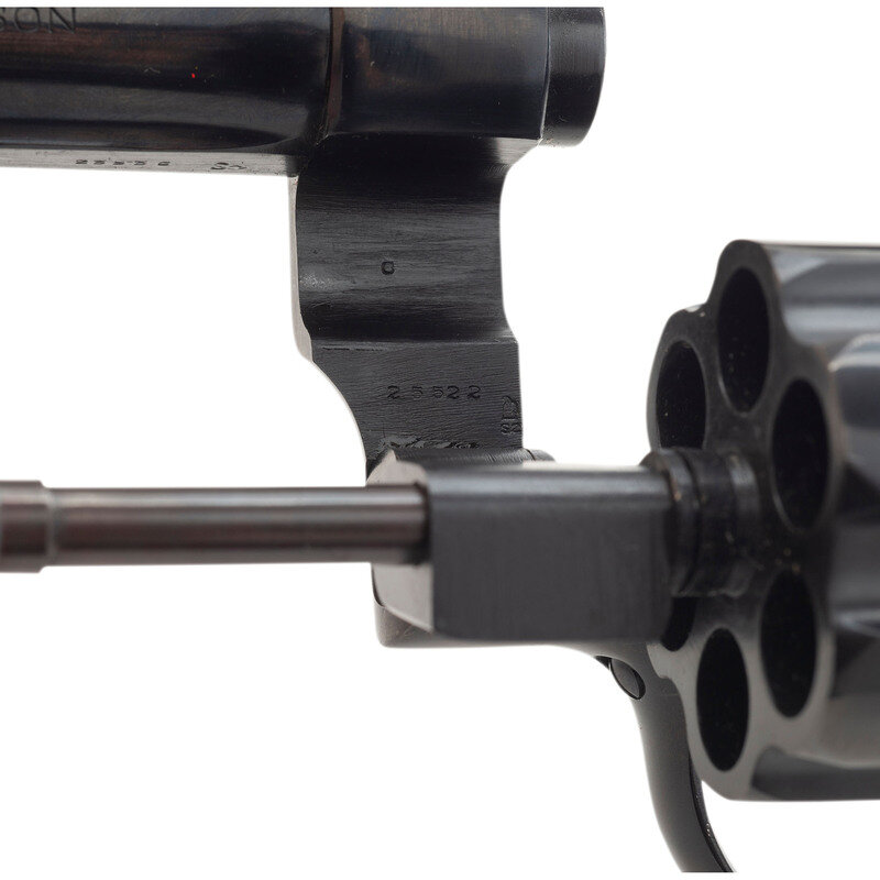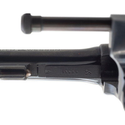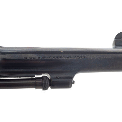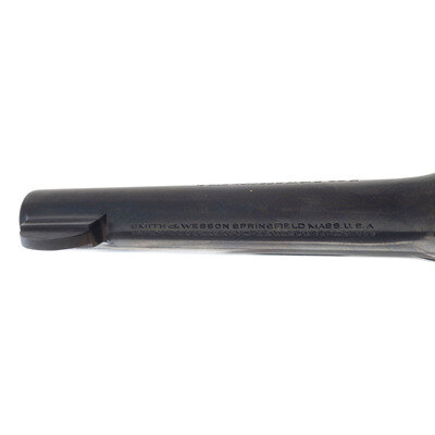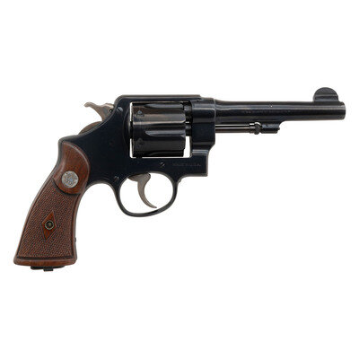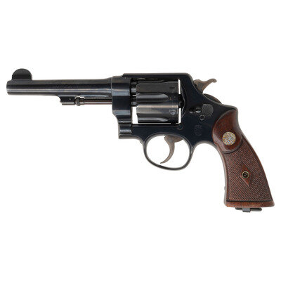 .44 Special. 5" barrel length. SN: 23936. Blued metal finish with casehardened hammer and trigger mounting checkered walnut Smith & Wesson medallion grips. Double action hand ejector revolver with six-shot cylinder and mounting topstrap notch and semi-circular front blade sights. Item features a five screw frame and pinned barrel, and shows matching serial numbers on the rear cylinder, inside surface of the star extractor, and on the underside of the barrel. Markings include the Smith & Wesson trademark on the left frame, and MADE IN U.S.A. on the right. Barrel marks read SMITH & WESSON to left barrel, 44 S&W SPECIAL CTG to the right, and the two-line address and patent mark to the top of the barrel. Address mark reads SMITH & WESSON SPRINGFIELD MASS. U.S.A./PATENTED DEC. 17. 1901. FEB. 6. 1906. SEPT. 14 1909. Interior frame shows an assembly number of 25522, and an {Eagle Head/S2}, indicating the frame was likely inspected for installation in a Model 1917, but later completed in the present model. Revolver features a lanyard loop to the butt. Grip panels have star marks struck into each butt indicating they are replacements. A boxed R-S marking on the grip frame indicates the item was factory refinished.