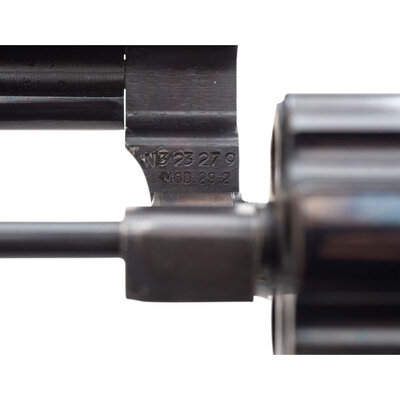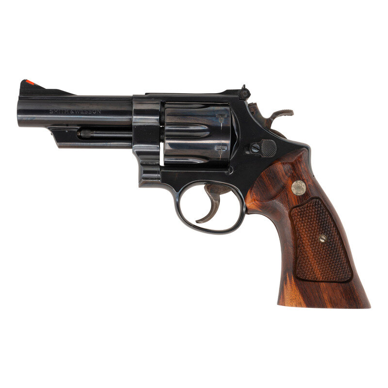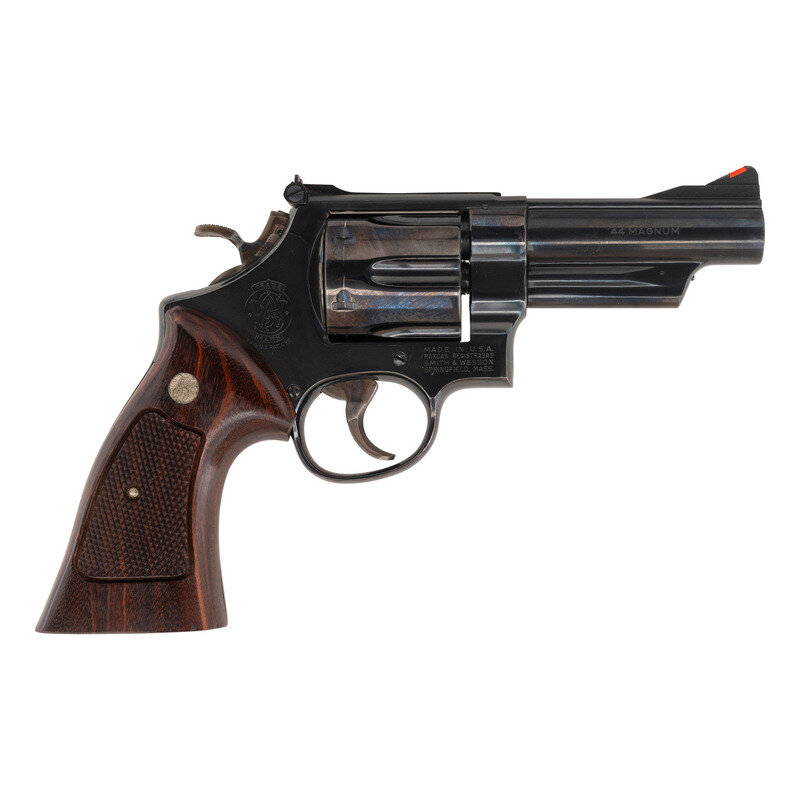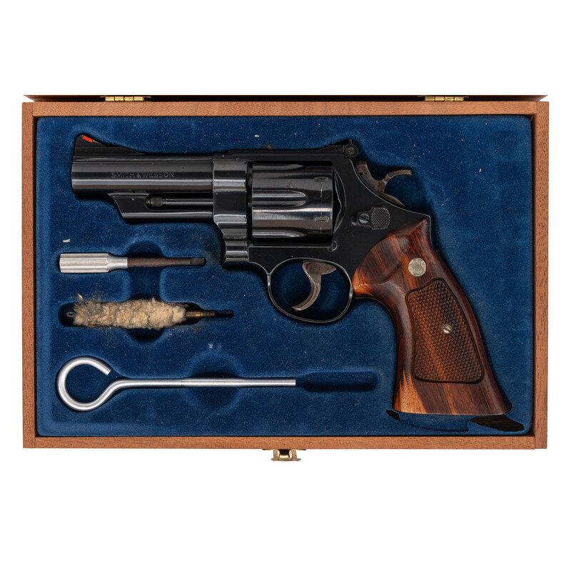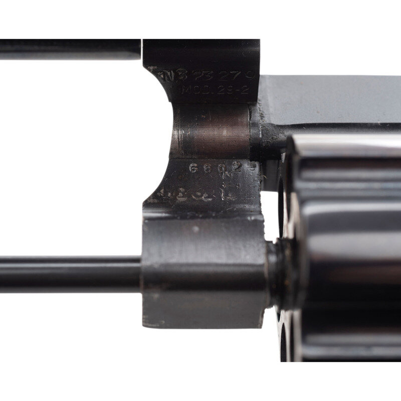 .44 Magnum. 4" barrel length. SN: N323279. Blued metal finish with color case hardened hammer and trigger mounting checkered Goncalo Alves Smith & Wesson medallion grips. Double action six-shot hand ejector revolver mounting red plastic insert Baughman Quick Draw front and adjustable white outline rear sights. Revolver features a pinned barrel and recessed cylinder on a three screw frame. Hammer and trigger are both the wide target models. Standard MOD. 29-2 mark appears to the inner frame with four-line address to the right and Smith & Wesson monogram trade mark to the sideplate. Item comes in a wood presentation case with flocked blue synthetic lining. Included in the case are the cleaning rod, bore mop, and screwdriver.