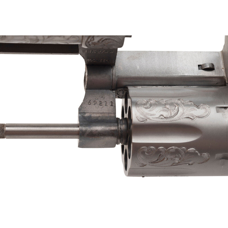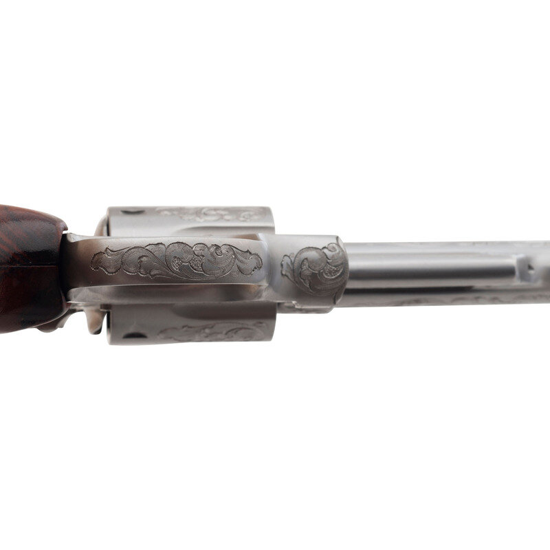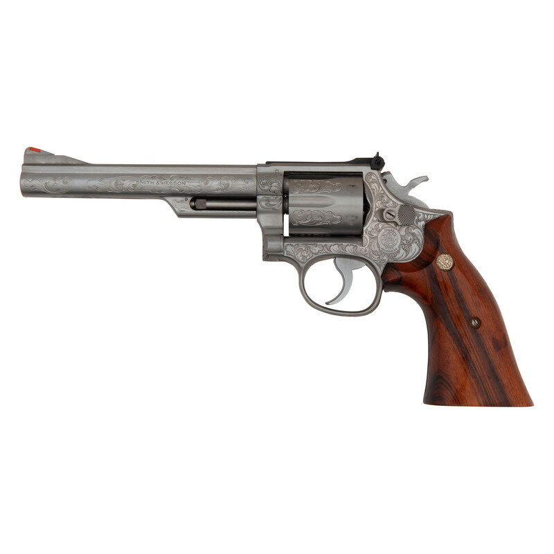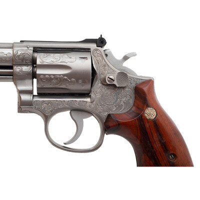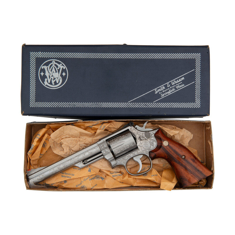 .357 Magnum. 6" barrel length. SN: 58K2744. Polished stainless steel finish with matte and matted barrel rib and topstrap featuring Class A Smith & Wesson factory engraving with smooth Goncalo Alves Smith & Wesson medallion grips. Double action hand ejector six-shot revolver mounting adjustable target rear notch and red plastic insert Baughman Quick Draw pattern front ramp sights. Revolver features a recessed cylinder and pinned barrel on a three screw frame. Smith & Wesson factory Class A engraving is applied to all major parts. The engraver's initials UU are struck into the rear cylinder, on the left frame below the grips, and inside of the barrel lug. Markings include SMITH & WESSON on the left barrel and S&W .357 MAGNUM to the right, both enclosed with foliate scrollwork bordering both. Right frame is marked with four line MADE IN U.S.A./MARCAS REGISTRADAS/SMITH & WESSON/SPRINGFIELD, MASS. Left frame is marked with Smith & Wesson's monogram trade mark enclosed in further foliate scroll with a beaded ground. Comes in its original blue carboard box with the cleaning kit and owner's manual with inserts.