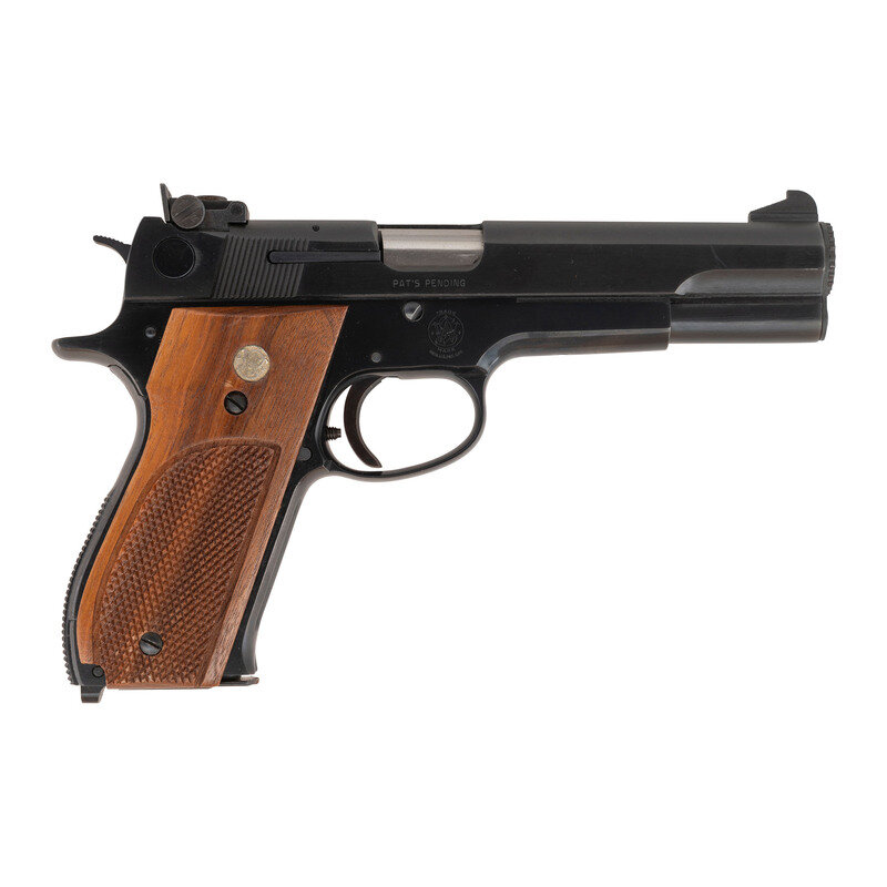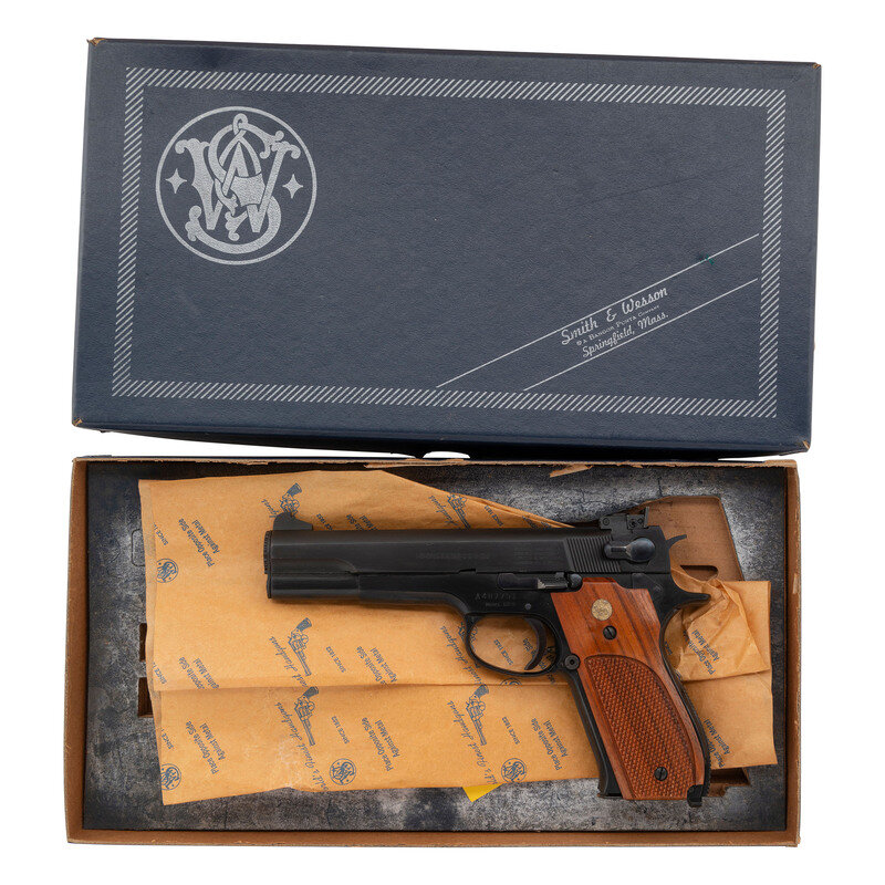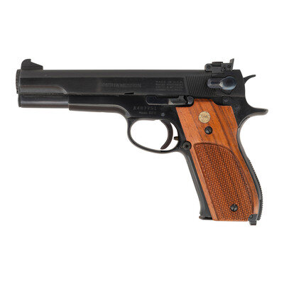 .38 Special Mid-Range Wadcutter. 5" barrel. SN: A487751. Blued finish, checkered hardwood S&W medallion grips. Single action magazine fed semi-automatic pistol that only accepts flush fit .38 Special wadcutter ammunition for use in Bullseye Matches. Standard Smith & Wesson markings, fully adjustable rear sight, ramped semi-Patridge front sight, adjustable trigger, adjustable barrel bushing. The pistol includes two magazines. The pistol is contained in its original blue cardboard factory box with the end label appropriately numbered to the gun. The box includes the original factory paperwork, as well as a cleaning rod and brush.