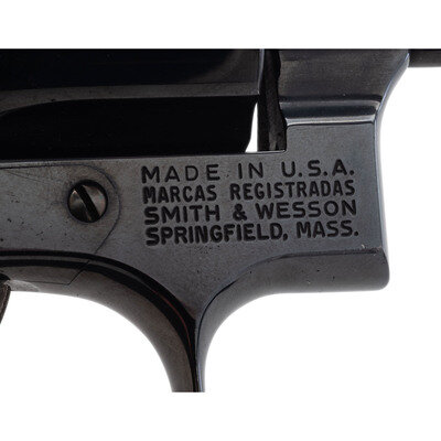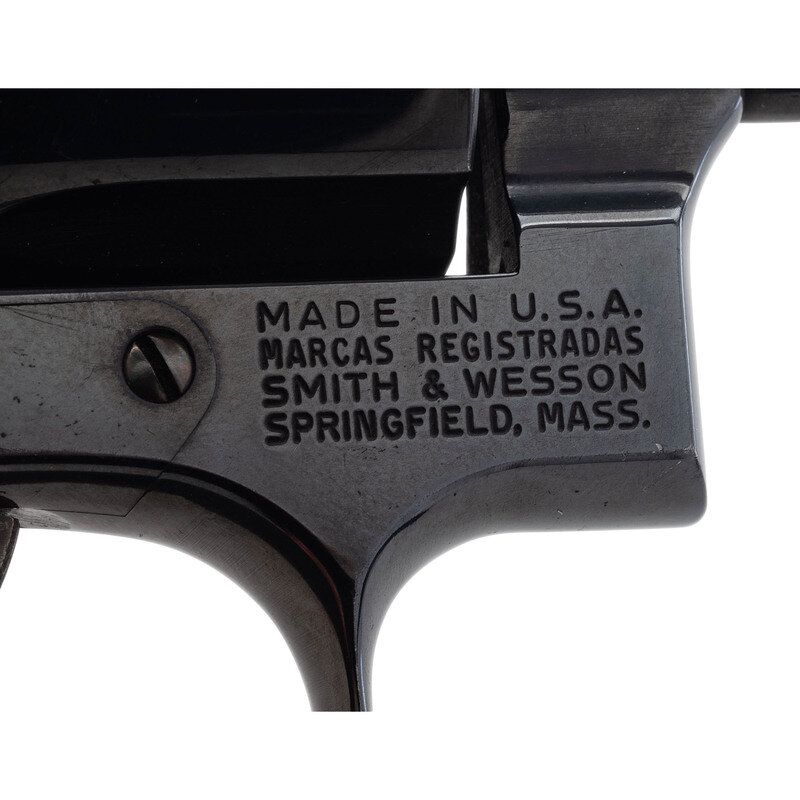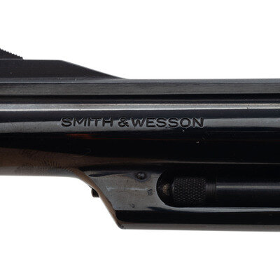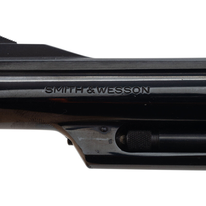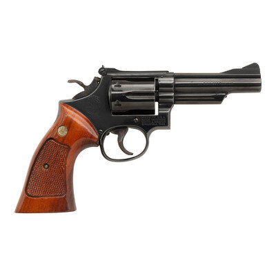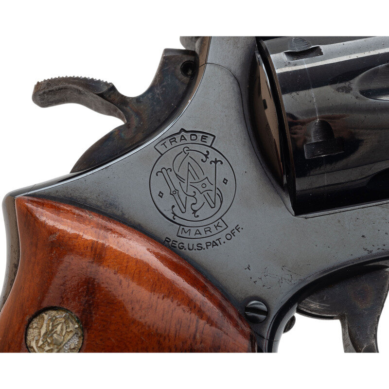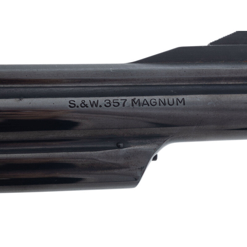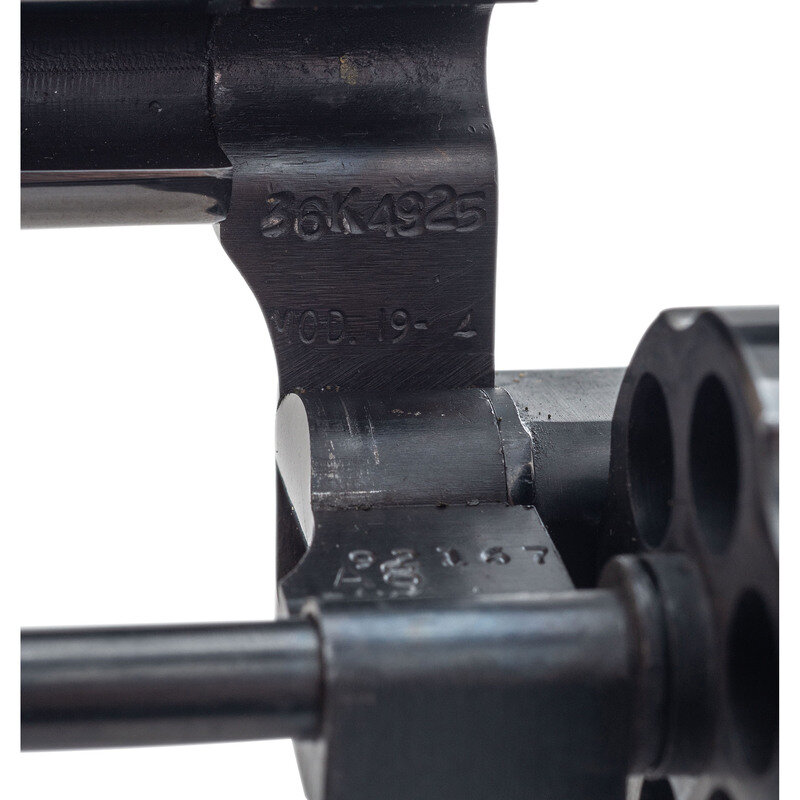 .357 Magnum. 4" barrel length. SN: 36K4925. Blued metal finish with casehardened hammer and trigger mounting Goncalo Alves Smith & Wesson medallion grips. Double action hand ejector revolver mounting adjustable rear notch and matted front ramp sights. Item shows the 19-4 model marking to the frame, and standard make and model markings overall. Utilizes the earlier pinned barrel and three screw frame.