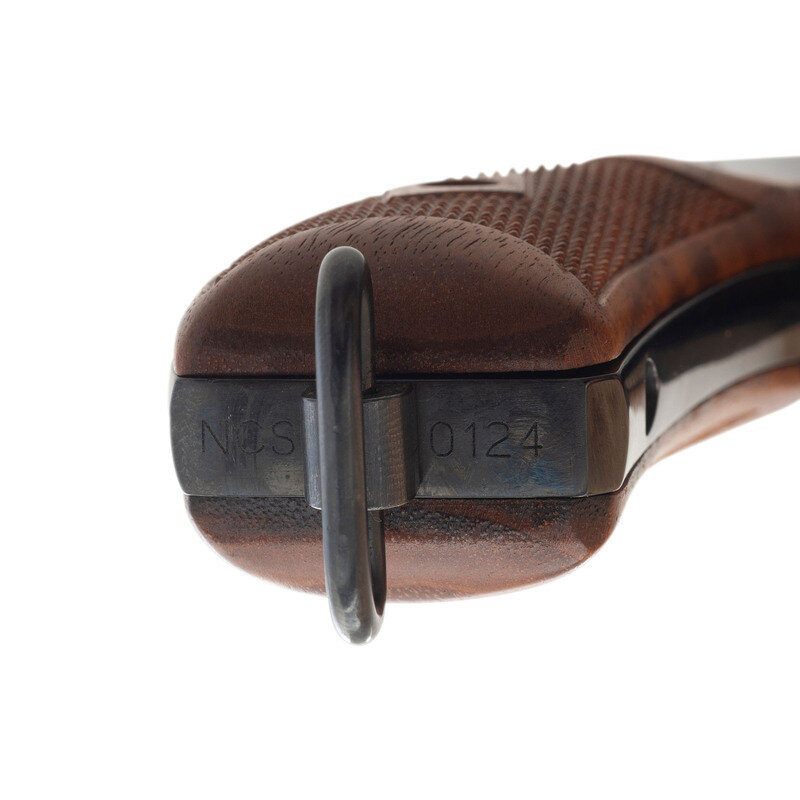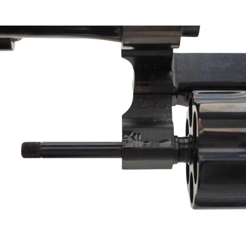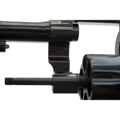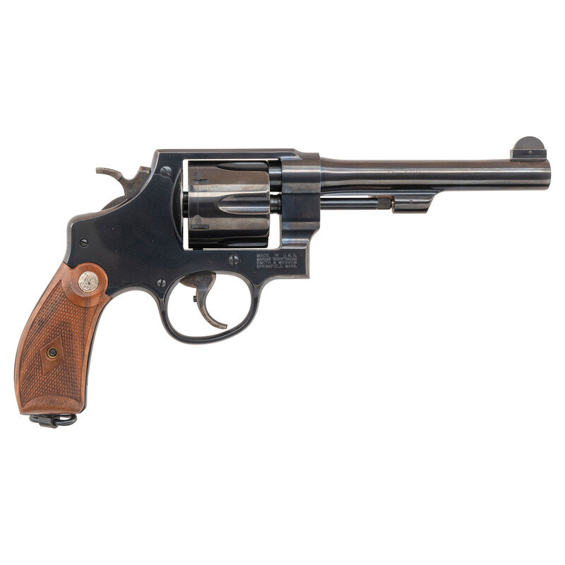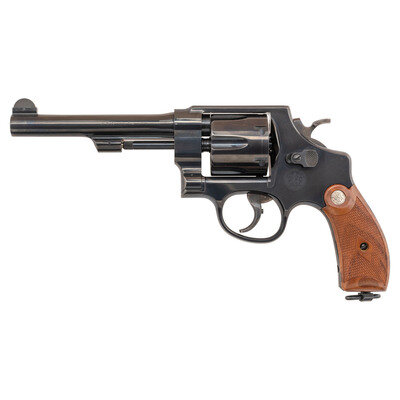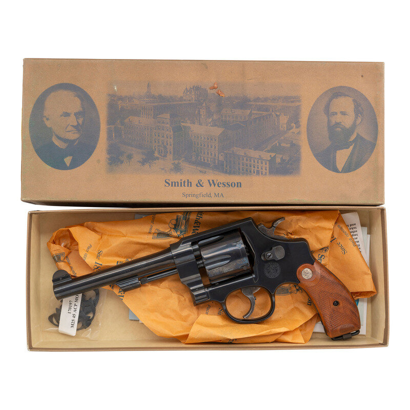 .45 ACP. 5.5" barrel length. SN: NCS0124. Blued metal finish with casehardened hammer and trigger mounting checkered walnut Smith & Wesson medallion grips and a lanyard loop to the butt. Double action six-shot hand ejector revolver featuring a pinned half-moon front blade and topstrap notch sights. Markings include 25-12 to the inner frame, along with the PERFORMANCE/CENTER seal to the left frame and standard markings elsewhere. Revolver comes in a matching gold cardboard box with six half-moon clips, and the owner's manual with inserts.