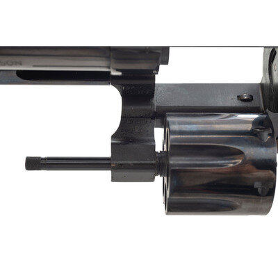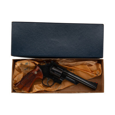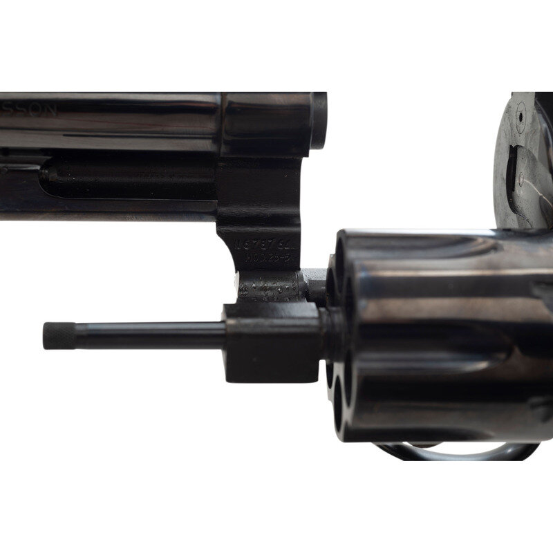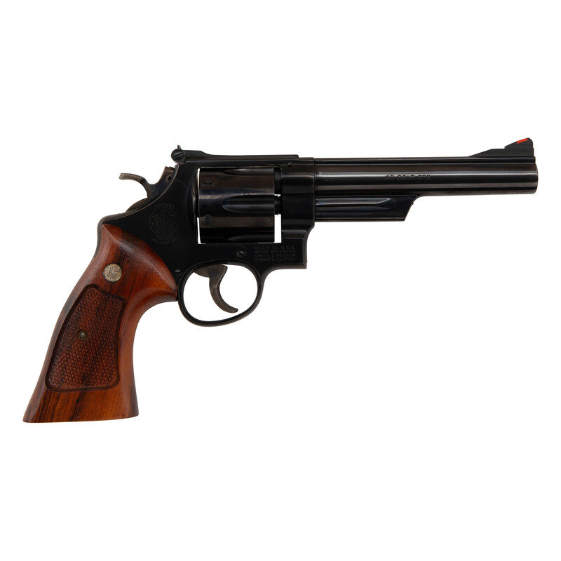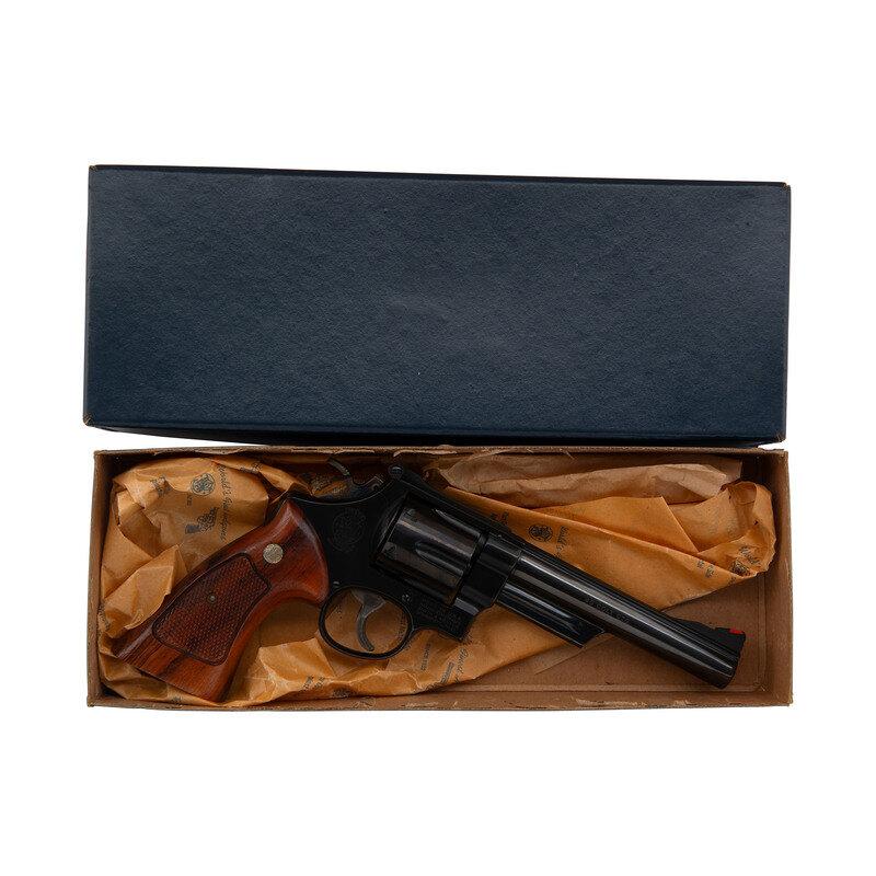 .45 Long Colt. 6" barrel length. SN: N678764. Blued metal finish with casehardened hammer and trigger mounting Smith & Wesson medallion Goncalo Alves grips. Double action six-shot hand ejector revolver mounting fully adjustable white outline rear notch and red insert Baughman Quick Draw pattern front sights. Revolver features a pinned barrel and non-recessed cylinder on a three screw frame, along with a hide target hammer and trigger. Standard make and model markings overall, including Smith & Wesson trade mark to the sideplate. Comes in a non-Smith & Wesson marked blue cardboard box.