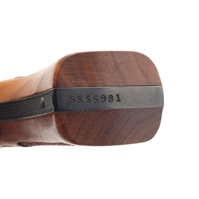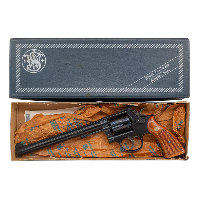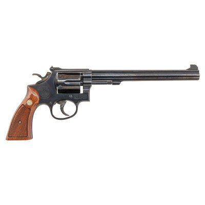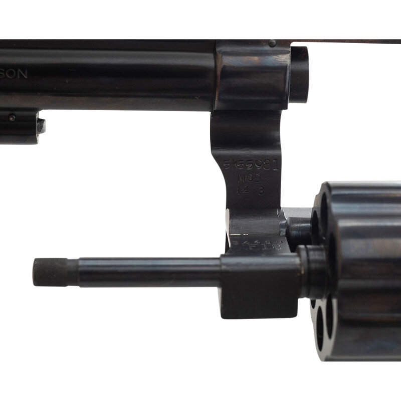 .38 Special. 8.375" barrel length. SN: 5K55981. Blued metal finish with casehardened hammer and trigger mounting checkered Smith & Wesson medallion walnut grips. Double action hand ejector six-shot revolver mounting adjustable target rear and Patridge front sights on a matted barrel rib. Item features a pinned barrel and non-recessed cylinder on a three screw frame with wide target hammer and trigger. Markings include the MOD./14-3 to the inner frame. Markings include the Smith & Wesson monogram trade mark on the sideplate along with four-line address to the right frame. Comes in a blue cardboard box with the serial number matching on the end label, along with the owner's manual with inserts.