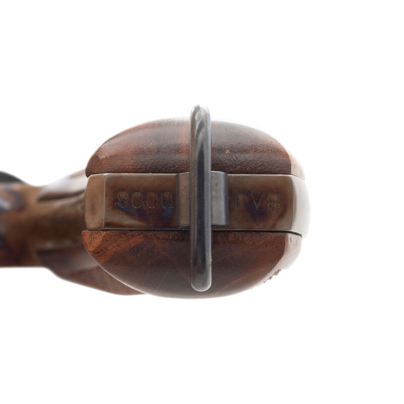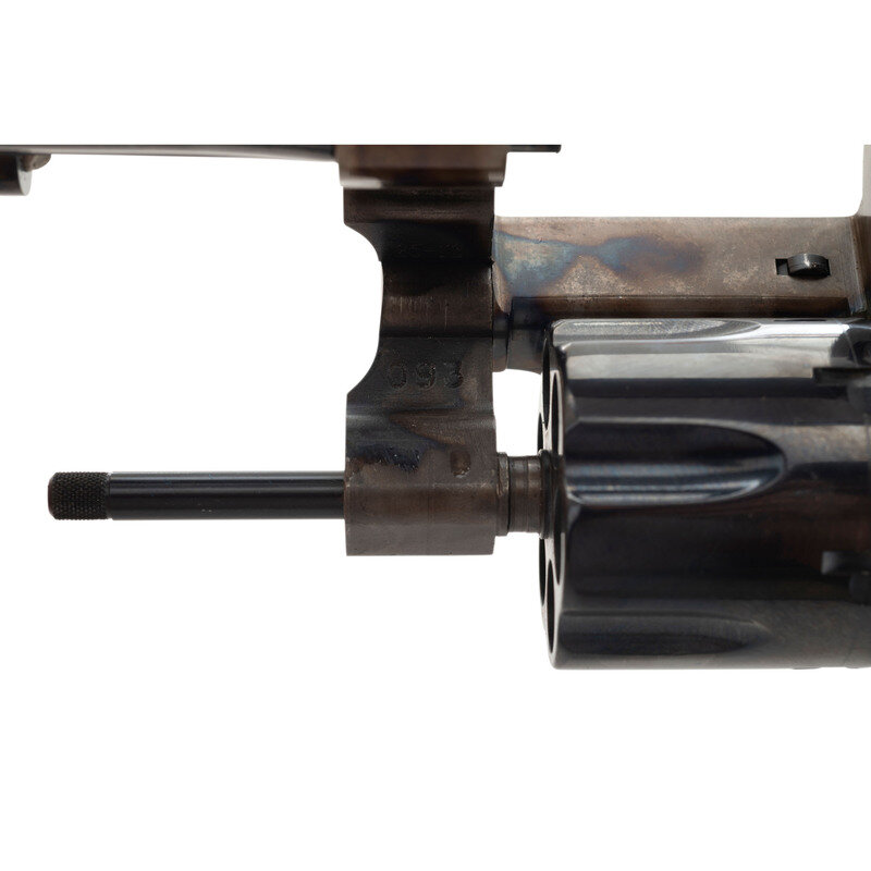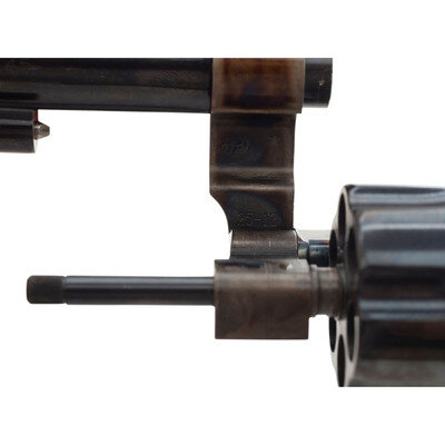 .45 ACP. 5.5" barrel length. SN: BAJ0008. Case colored frame with casehardened hammer and trigger, remaining metal parts blued, and mounting checkered walnut Smith & Wesson medallion grips. Double action six-shot hand ejector revolver featuring pinned half-moon front blade and topstrap notch rear sights. Revolver features a lanyard loop to the butt, PERFORMANCE/CENTER mark to the left frame, and standard make and model markings overall. Comes in a matching gold cardboard box with trigger lock in package, three full moon clips, and the owner's manual with inserts.