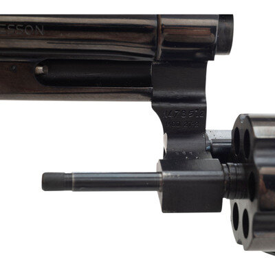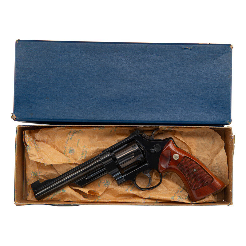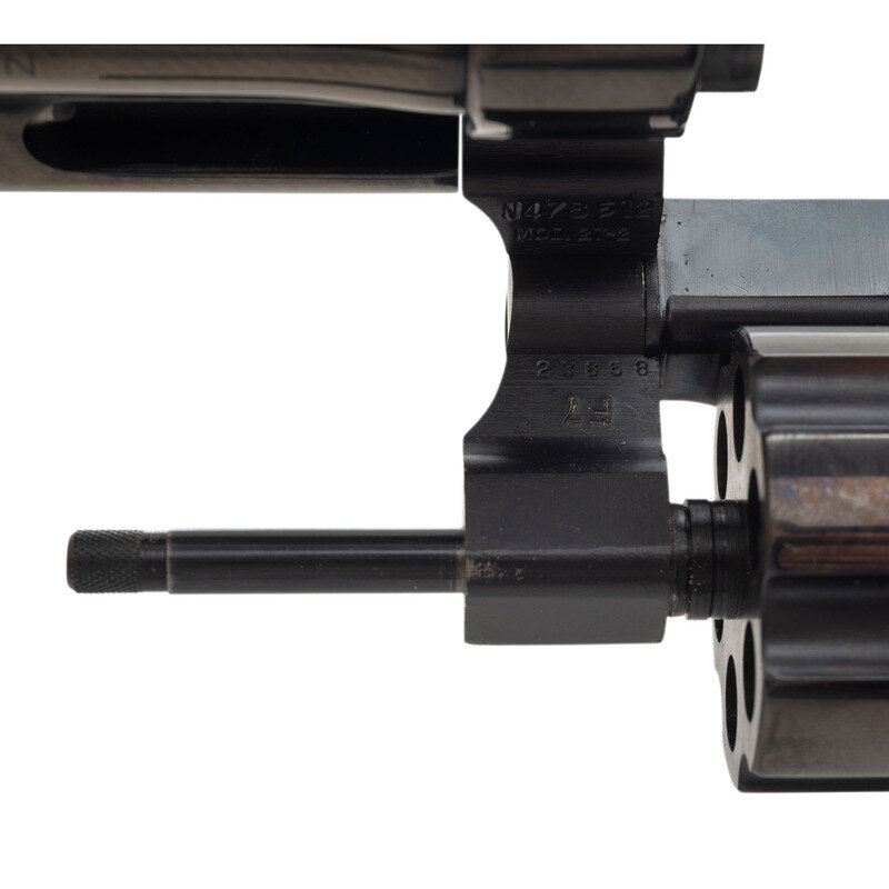 .357 Magnum. 5.875" barrel length. SN: N478512. Blued metal finish with casehardened hammer and trigger mounting polished checkered walnut Smith & Wesson medallion grips. Double action six-shot hand-ejector revolver mounting adjustable rear notch and Patridge front blade sights on a knurled barrel rib. Revolver features a recessed cylinder and pinned barrel on a three screw frame, along with a wide target hammer and trigger. Item shows standard make and model markings overall, including MOD. 27-2 mark to the inner frame. Comes in a non-marked blue cardboard box with the owner's manual.