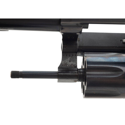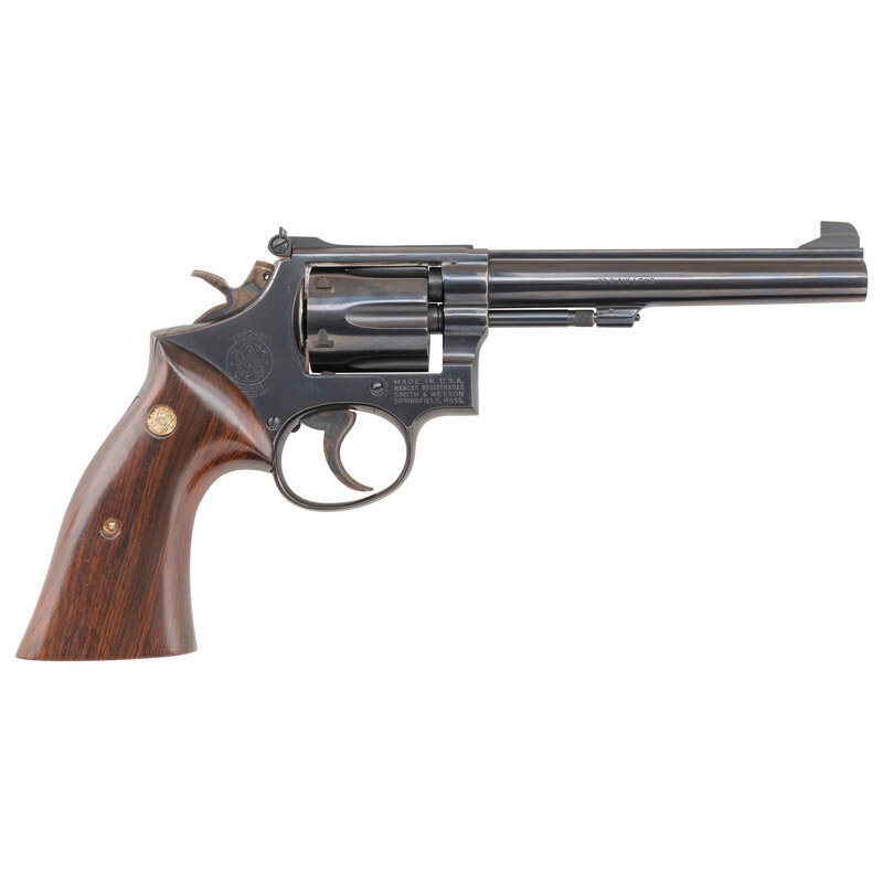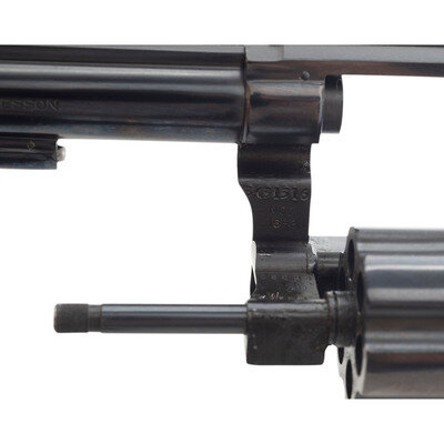 .32 S&W Long. 6" barrel length. SN: 3K31316. Blued metal finish with casehardened hammer and trigger mounting replaced smooth Smith & Wesson medallion Cocobolo grips. Double action hand ejector six-shot revolver featuring a pinned barrel and non-recessed cylinder on a three-screw frame. Sights consist of an adjustable target rear notch and Patridge front sight atop a matted barrel rib. Markings include MOD./16-3 to the inner frame, Smith & Wesson monogram trade mark on the sideplate, and four-line address to the right frame. Comes in a matching blue cardboard box with the owner's manual.