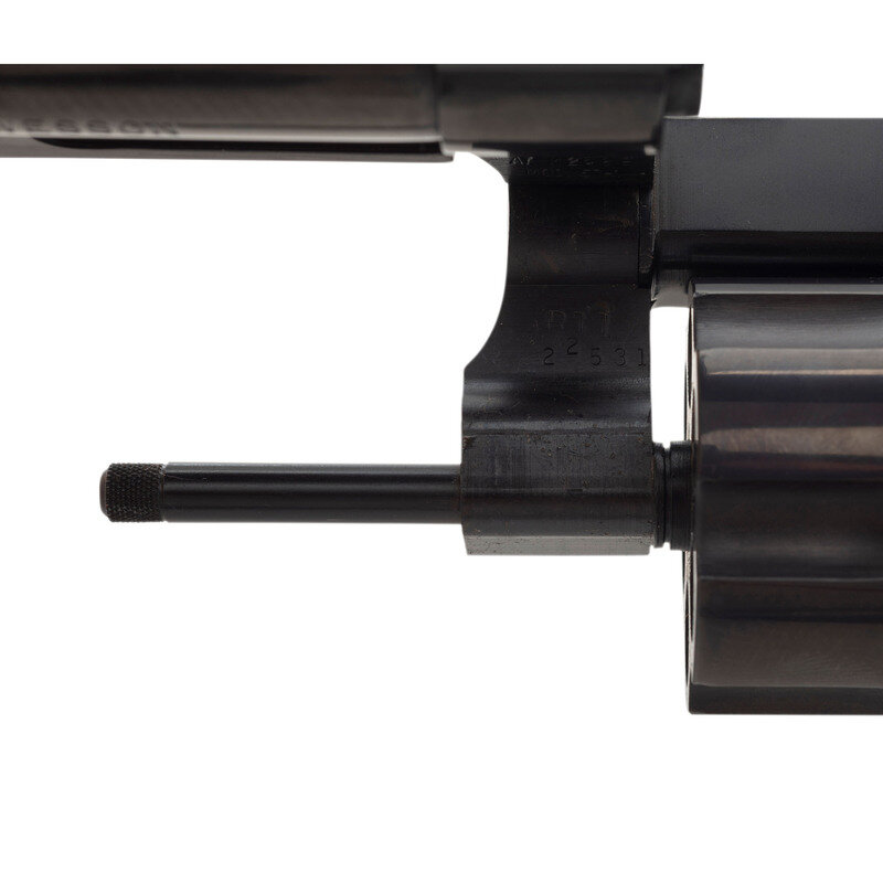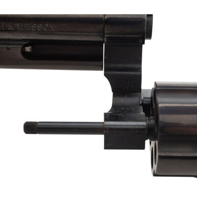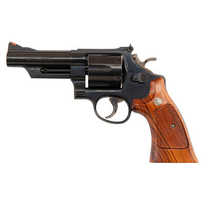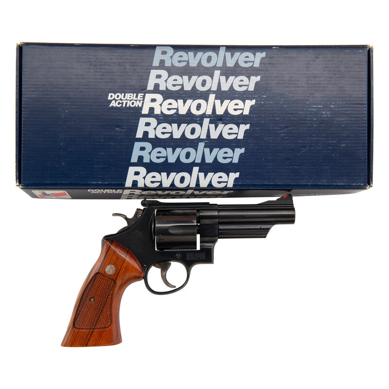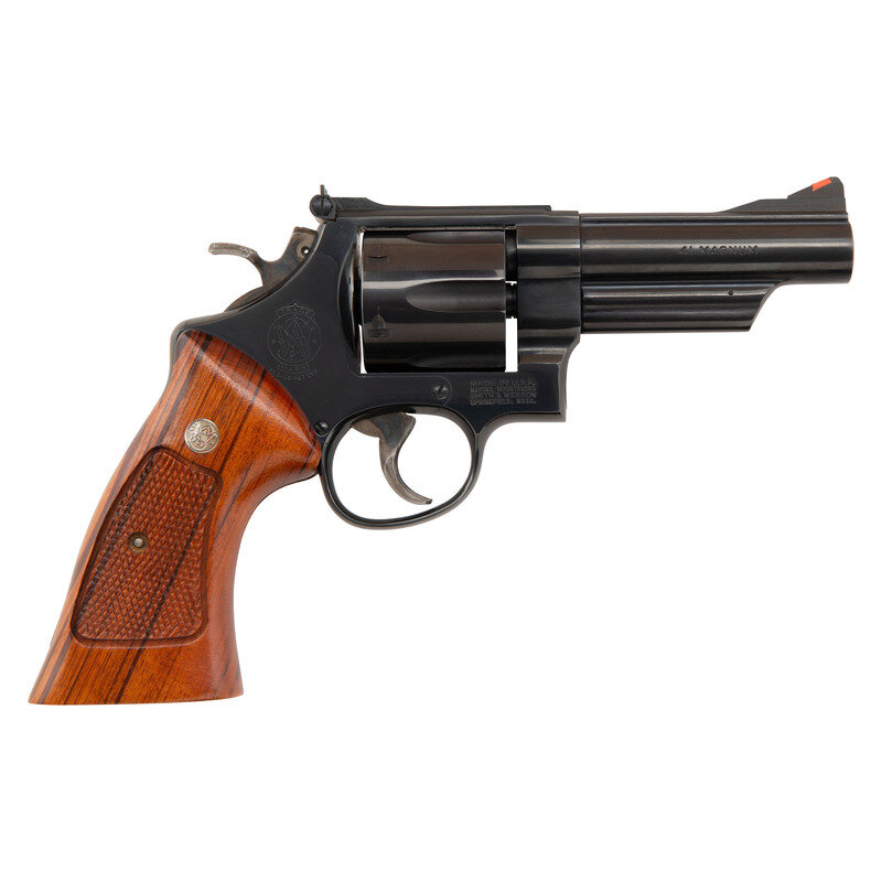 .41 Magnum. 4" barrel length. SN: AYM2689. Blued metal finish, casehardened hammer and trigger, and mounting Smith & Wesson medallion checkered Goncalo Alves grips. Double action six-shot hand ejector revolver mounting red plastic insert Baughman Quick Draw front sight, and fully adjustable white outline rear sight. Revolver features a wide target hammer and trigger. Standard make and model markings overall. Comes with a matching Smith & Wesson marked blue cardboard box with the owner's manual, and a cleaning kit in sealed package.