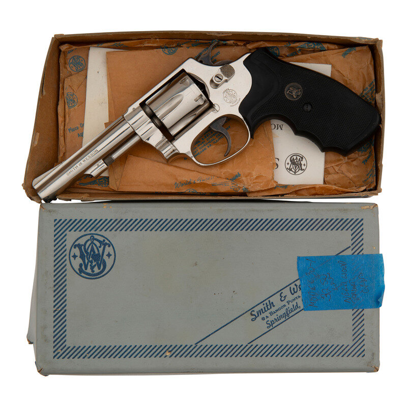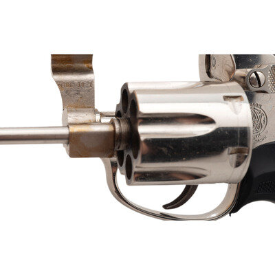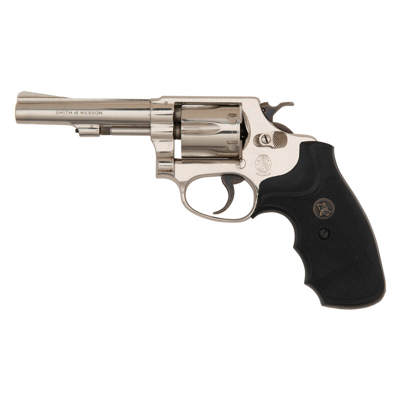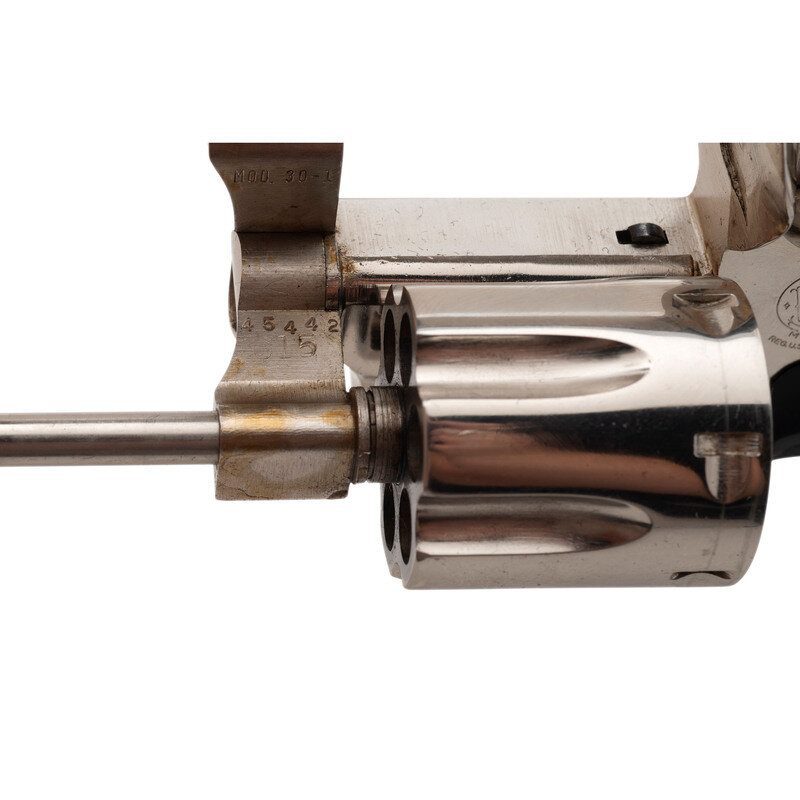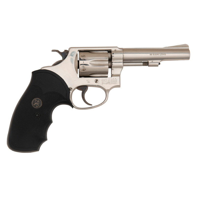 .32 S&W Long. 4" barrel length. SN: H83223. Nickel plated finish with color case hardened hammer and trigger mounting black rubber Pachmayr GRIPPER one piece grips. Double action hand ejector revolver with six-shot cylinder and pinned barrel. Item features a matte finish to the full length barrel rib, and mounts topstrap notch and matted front ramp sights. Markings include the standard Smith & Wesson monogram trade mark on the left frame, and MOD. 30-1 marking to the inner frame. Item comes in its original pale blue cardboard box with owner's manual.