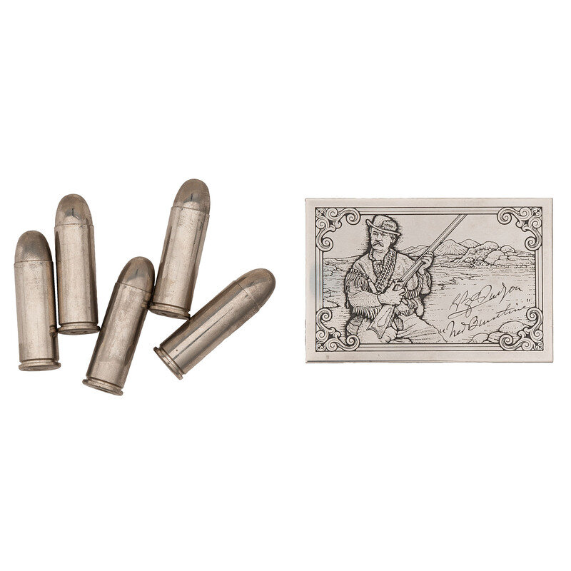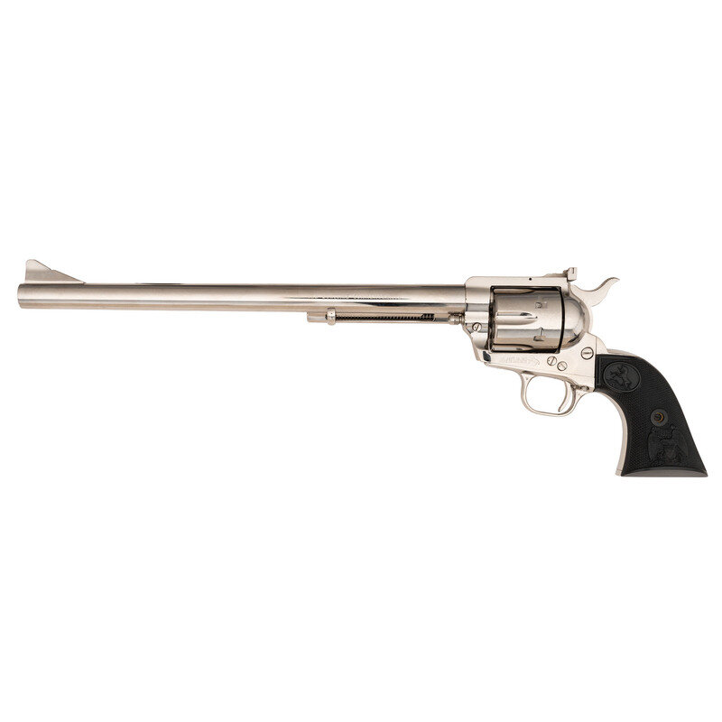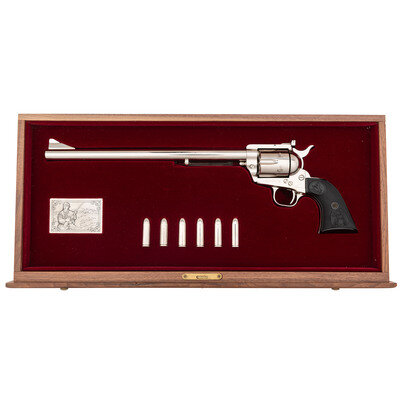 .45 Long Colt. 12" barrel length. SN: NB1503. Nickel plated finish overall mounting black synthetic Colt Eagle grips commemorating the legacy of Ned Buntline, the famed dime novelist who was alleged to have ordered specially built 12 inch barreled Colt revolvers for famed lawmen Wyatt Earp, Bat Masterson, and others. Single-action loading gate six shot revolver featuring a flat topstrap mounting adjustable target rear and matted front ramp sights. Left frame shows the standard two-line patent mark followed by {Rampant Colt} logo. Left barrel is struck NED BUNTLINE SPECIAL with the single line address on top reading COLT'S PT. F.A. MFG. CO. HARTFORD, CT. U.S.A. with caliber marking to the right reading COLT NEW FRONTIER S.A.A. .45. Item comes in a wood display case with red velvet lining, a set of six nickel finished dummy rounds, and an engraved plaque bearing the likeness of Ned Buntline beside his signature. Item additionally comes with the key in plastic package, further five nickel plated dummy rounds, and an extra display plate.