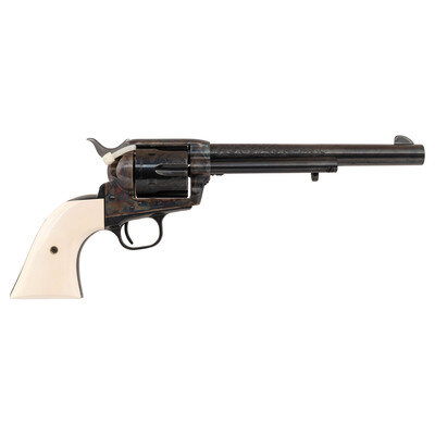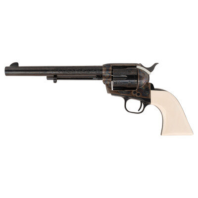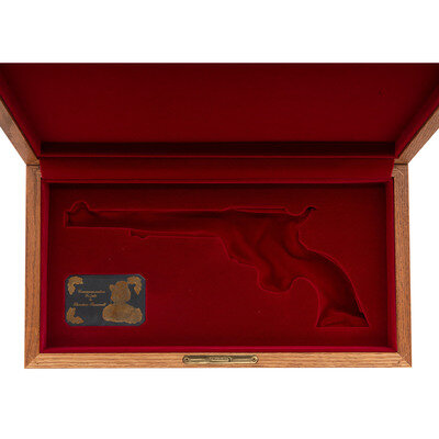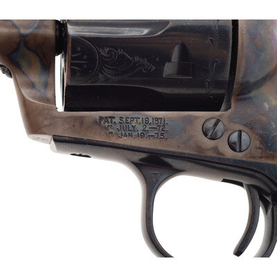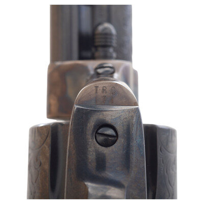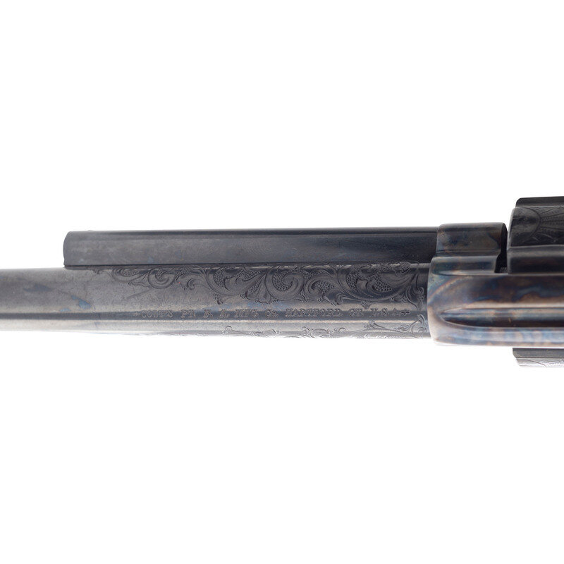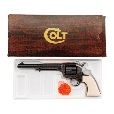 .44-40. 7.5" barrel. SN: TRC171. Blued and color casehardened finish, smooth faux ivory one-piece grip. Single action solid black powder frame revolver with loading gate and fluted six-chambered cylinder and bullseye ejector rod head. Revolver is marked with early style Colt "Italicized" one-line Hartford address on the barrel and the three-date in three-line patent information on the lower left of the frame. The top of the gripstrap has a gold TR monogram. The revolver is further enhanced with factory "B" flowing New York style Arabesque scroll engraving on the rear half of the barrel and between the cylinder chambers. The revolver includes its original Colt factory wood display box with burgundy crushed velvet lined form-fitting interior, the original wood grain revolver box with detached, but correct end label, factory paperwork and factory shipping box which both the items fit in. Only 500 of these guns, serial numbered TRC-001 to TRC-500, were produced in 1984. The MSRP was $1,695 at that time, roughly $5,000 adjusted for inflation.