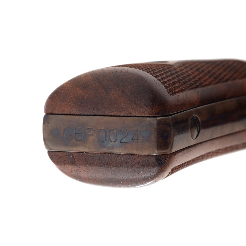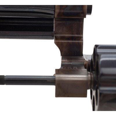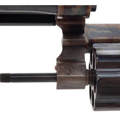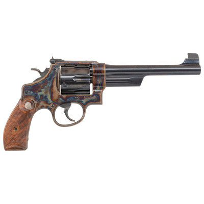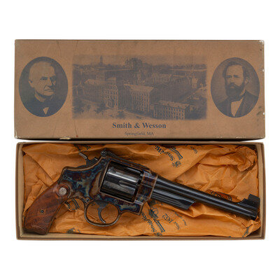 .45 Long Colt. 6.5" barrel length. SN: CBP0024. Case colored frame with casehardened hammer and trigger, remaining metal parts blued, and mounting checkered walnut Smith & Wesson medallion grips. Double action six-shot hand ejector revolver featuring pinned gold bead front and adjustable target rear notch sights. Markings include 25-11 model marking to the inner frame and PERFORMANCE/CENTER seal to the left frame. Standard make and caliber markings elsewhere. Item comes in a matching gold cardboard box with the owner's manual.