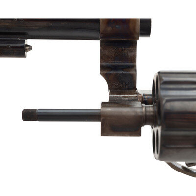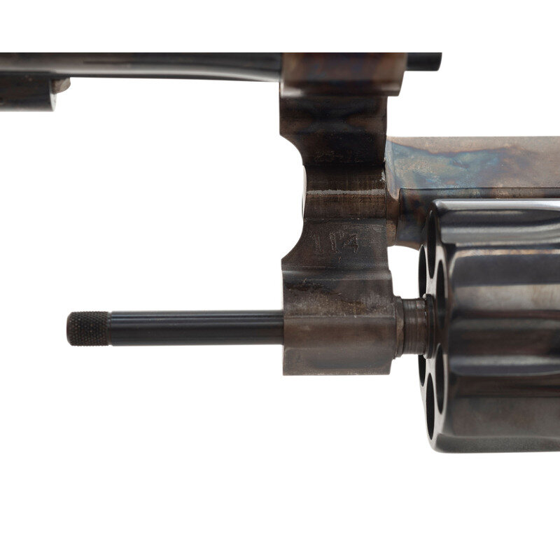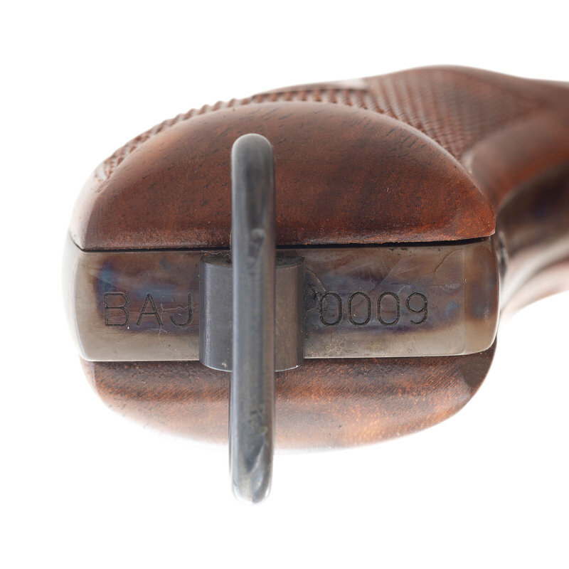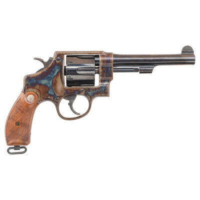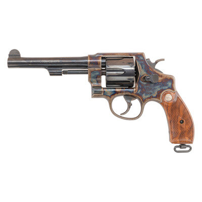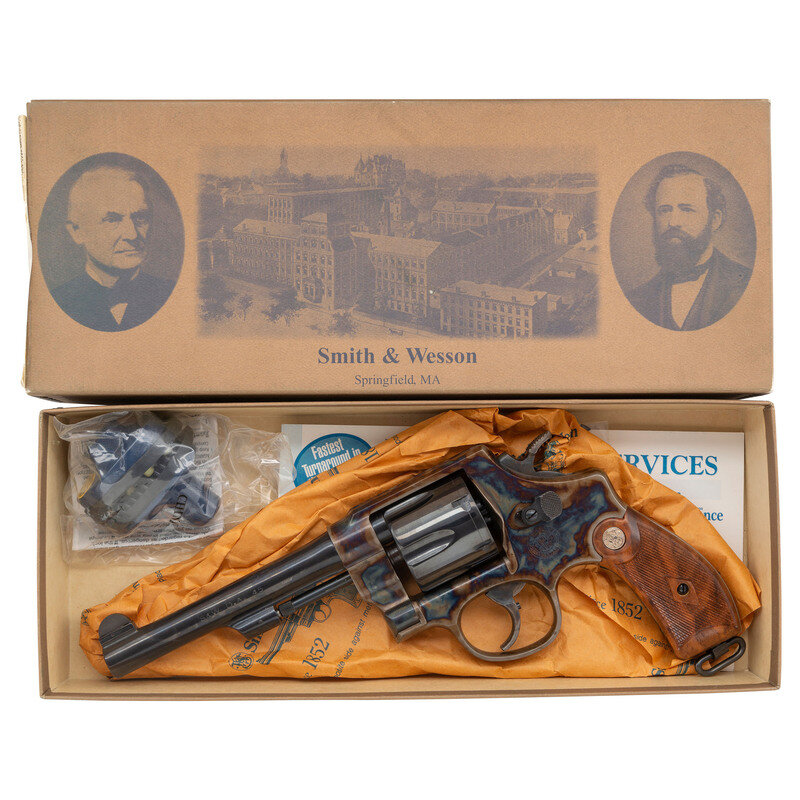 .45 ACP. 5.5" barrel length. SN: BAJ0009. Case colored frame, casehardened hammer and trigger, balance of parts blued, and mounting Smith & Wesson medallion walnut grips. Double action six-shot hand ejector revolver featuring pinned half-moon and topstrap notch sights. Left frame displays Smith & Wesson's Performance Center seal with further markings including 25-12 model marking to the inner frame. Comes in gold colored matching Smith & Wesson marked cardboard box with trigger lock, two full moon clips, and the owner's manual.