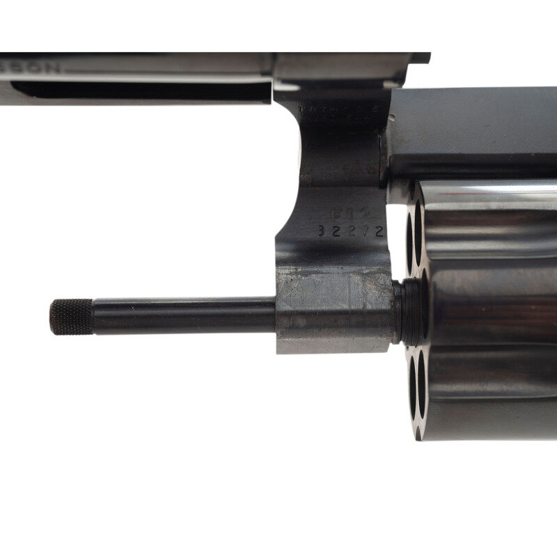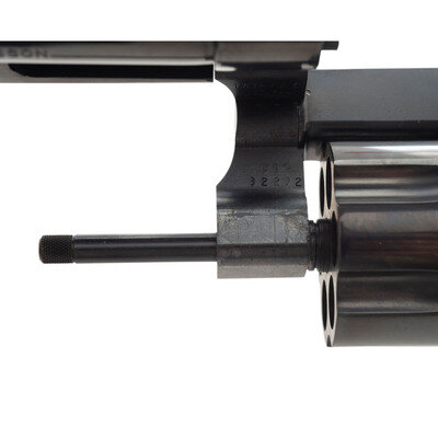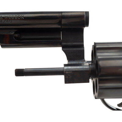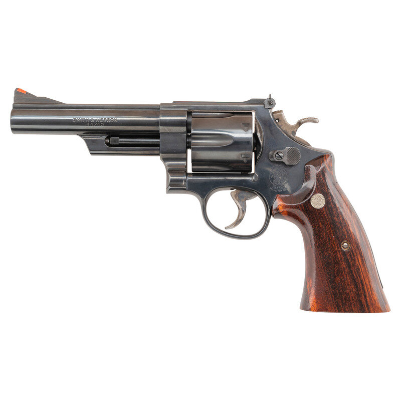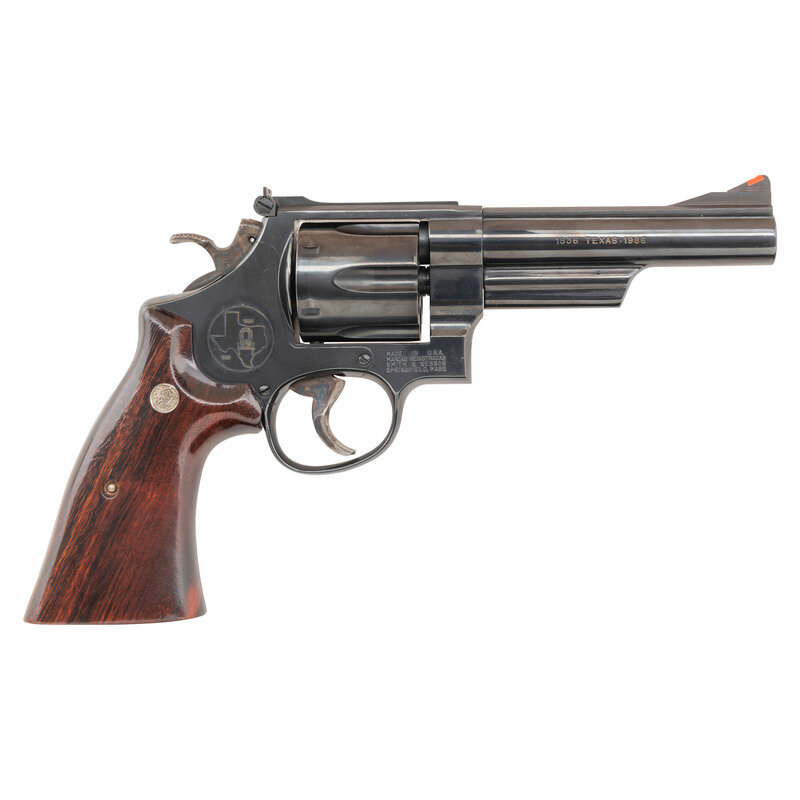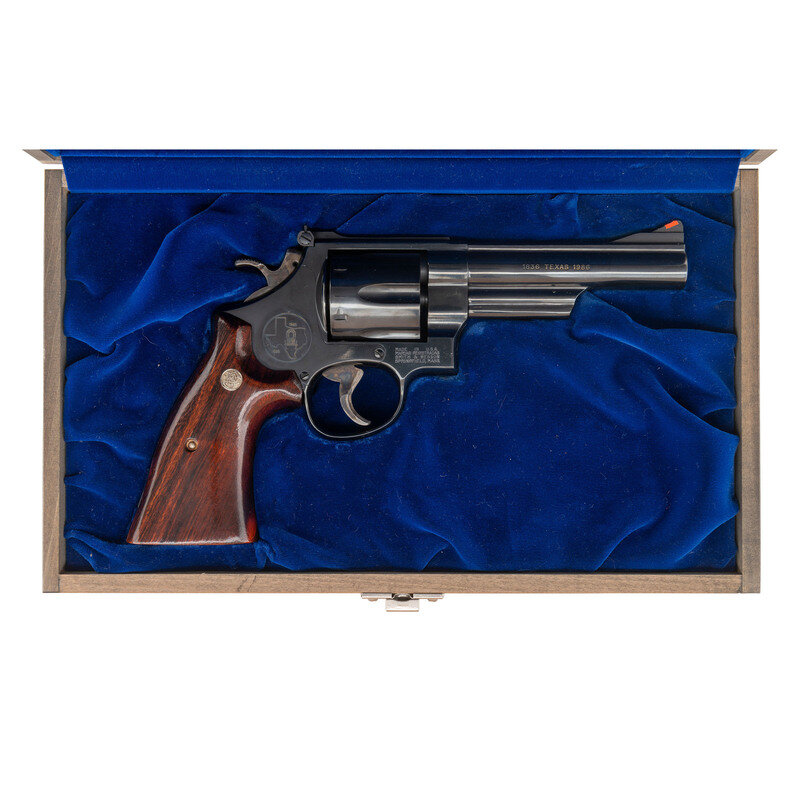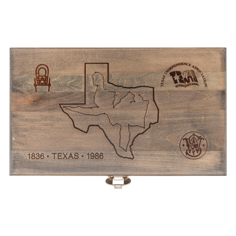 .44-40. 5" barrel with matted rib. SN: TWT4685. Blued finish, color casehardened trigger and hammer, smooth oversized figured hardwood square butt combat grips with S&W medallions. Double action revolver with white U-outline adjustable rear sight, ramped front sight with orange insert and swing out six-chambered fluted cylinder. Left side of barrel roll marked SMITH & WESSON over 44/40. Right side roll marked 1836 TEXAS 1986 with gold washed filler. Left rear of frame with Texas logo and sesquicentennial dates. S&W logo on left rear of frame. The revolver is contained in a S&W wood presentation box laser engraved on the lid with the state of Texas, S&W Logos, etc. and has a fitted interior with a crushed blue velvet lining. A key for the case is also included.