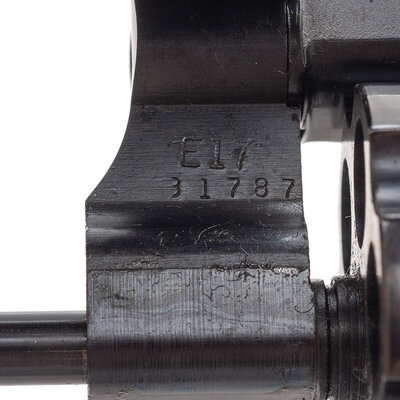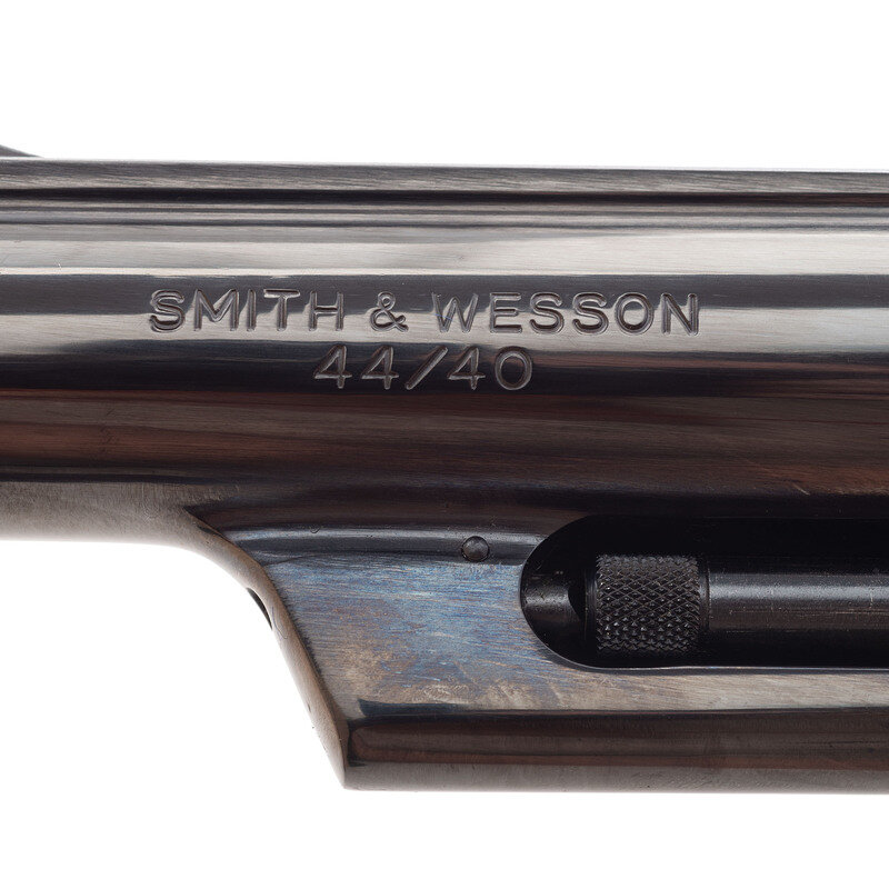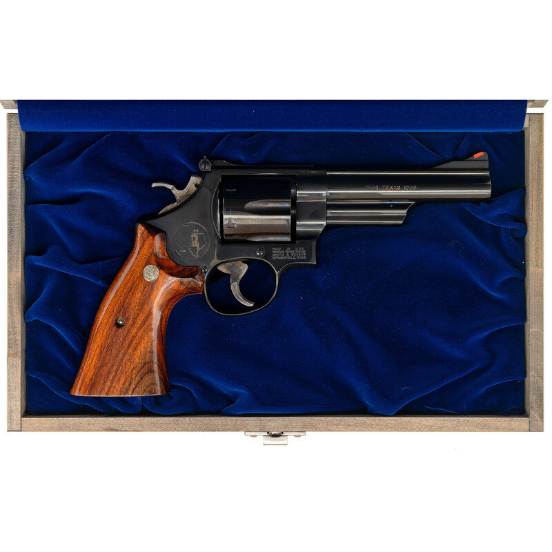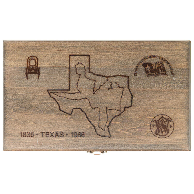 .44-40. 5" barrel length. SN: TWT3892. Blued metal finish overall with casehardened hammer and trigger mounting smooth Smith & Wesson medallion grips. Double-action hand ejector commemorating the 150th anniversary of the state of Texas. Item features adjustable white outline rear target and red plastic insert Baughman Quick Draw front sights. Item shows standard make and model markings with the Smith & Wesson monogram trademark struck into the left frame. Further embellishments include 1836 TEXAS 1986 to the right barrel, and an emblem for the 150th anniversary on the sideplate featuring the outline of Texas enclosing a Conestoga wagon set between the dates covered by barrel marking. Revolver comes packaged in its original blue cardboard box with the owner's manual and ad inserts, an unused cleaning kit, and a wood display case embellished with a river map of Texas flanked by a Conestoga wagon, the seal of the TEXAS INDEPENDANCE ASSOCIATION, Smith & Wesson monogram, and 1836 TEXAS 1986. Case is lined in blue velvet and comes with a key in its package.
