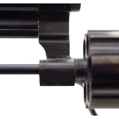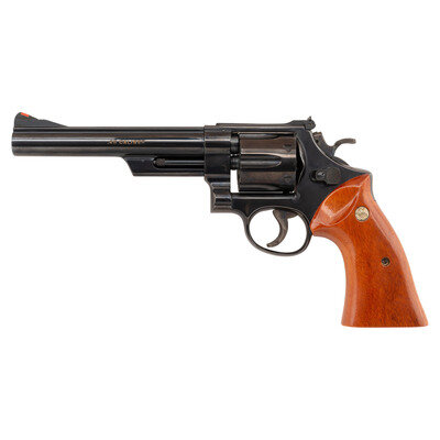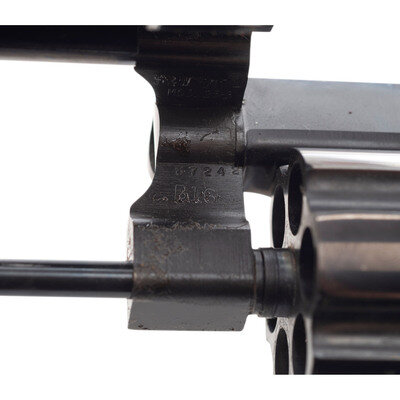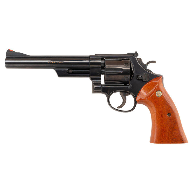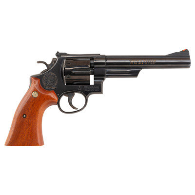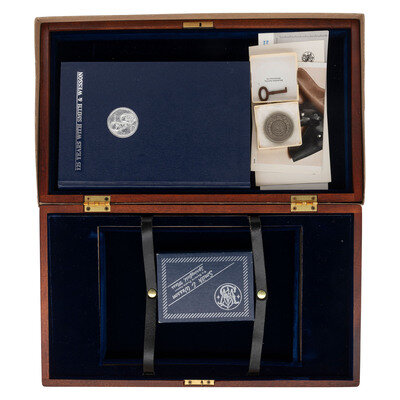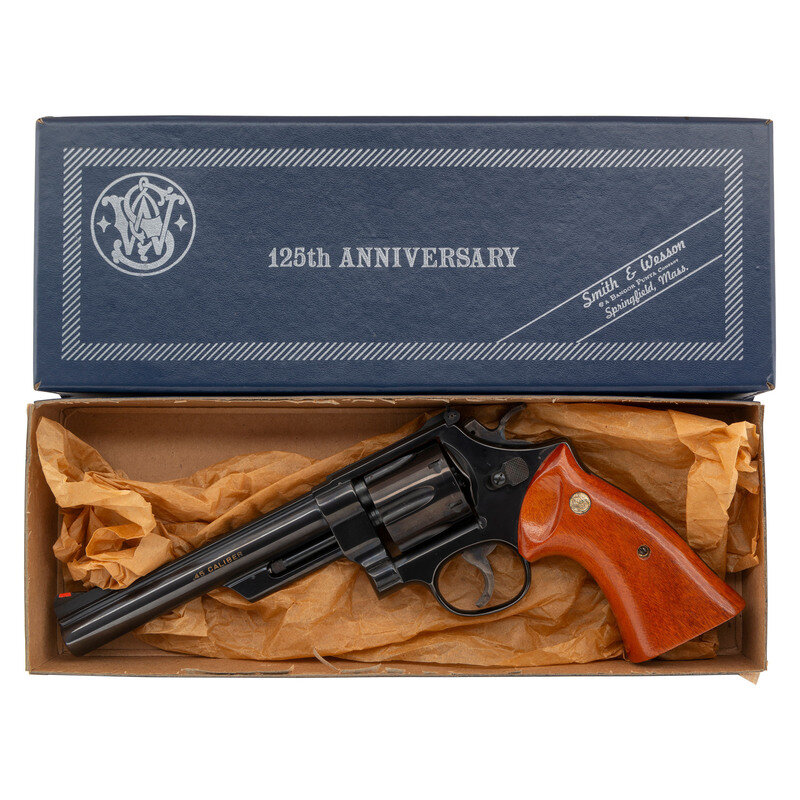 .45 Colt. 6.5" matted rib barrel. SN: S&W0174. Blued finish, color casehardened trigger and hammer, two-piece oversized S&W gold medallion smooth square butt grips. Double action revolver with swing out six-chambered fluted cylinder. Barrel roll marked SMITH & WESSON/125TH ANNIVERSARY on the right side with gold highlights and .45 CALIBER on the left, again with gold highlights in the marking. The Smith & Wesson logo on the right rear of the frame further lists the dates 1852-1977 and "125 YEARS" with gold accents. Wide checkered target hammer, grooved wide trigger, adjustable white U-outline rear sight, ramped front sight with orange insert. The revolver is in its blue cardboard "125th Anniversary" marked box and is accompanied by the wood factory display case with blue crushed velvet lining and inserts. The gun is further accompanied by a commemorative book entitled 125 Years with Smith & Wesson by Roy Jinks and a commemorative display coin. All is contained in the original cardboard shipping box. Only 10,000 of these guns were produced in 1977 with an issue price of $350, equivalent to slightly less than $1,800 today, adjusted for inflation.