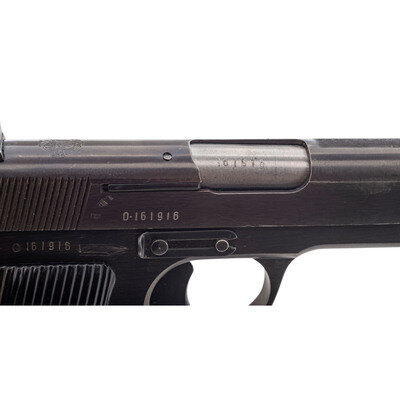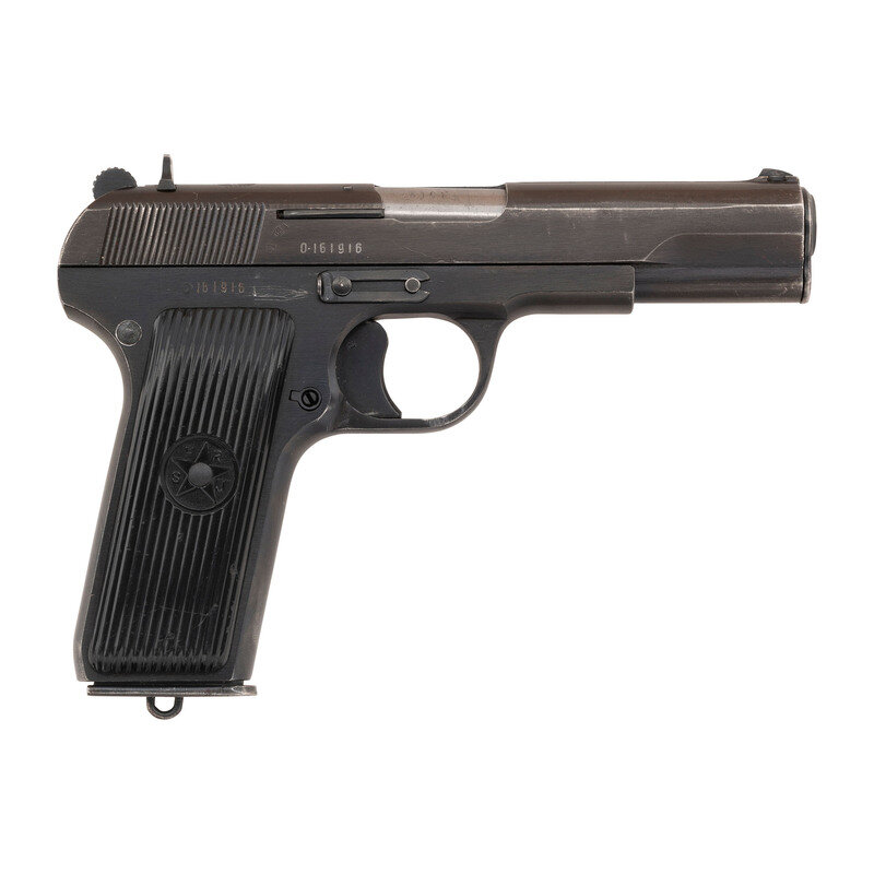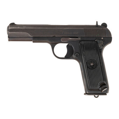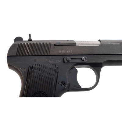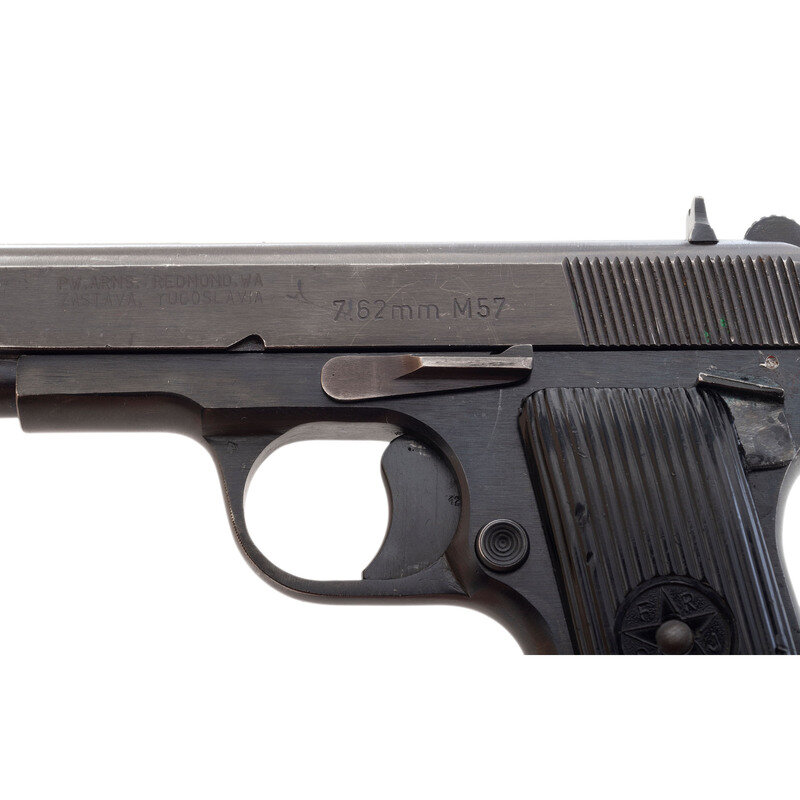 7.62x25mm. 4.6" barrel length. SN: O161916. Blued metal finish overall with polished barrel and mounting black synthetic grips with molded five point star enclosed by the initials SFRJ for Yugoslavia. Short-recoil operated single action autoloading pistol fed by detachable single-stack magazines and following the pattern of the Soviet Tokarev pistol. Item has been retrofitted with a manually actuated safety lever at the rear left frame with the grip panel cut down to accommodate it. Further markings to the pistol include the {Seal of Yugoslavia} to the top slide near the rear sight, 7.62mm M57 to left slide, and the importer marking PW. ARMS. REDMOND. WA/ZASTAVA, YUGOSLAVIA. Serial numbers match on the barrel, frame, and slide. Comes with one magazine with lanyard loop to floorplate.