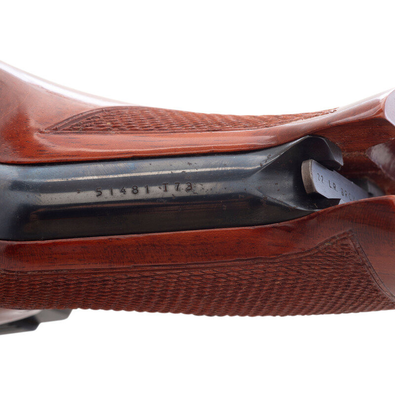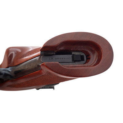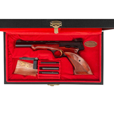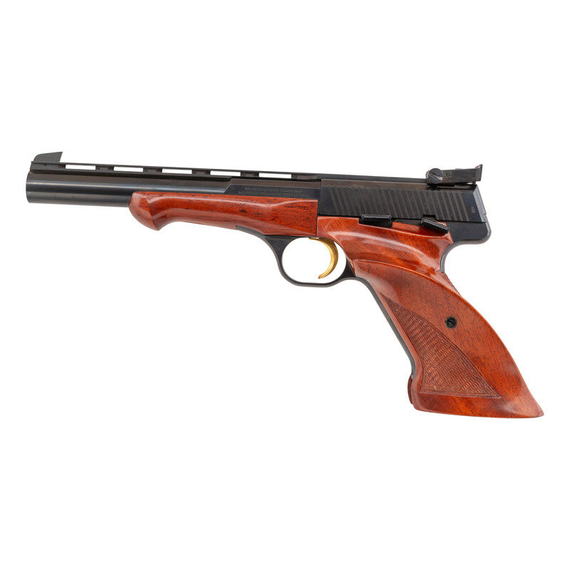 .22 LR. 6.75" barrel length. SN: 51481T73. Blued metal finish overall with gold trigger displaying polished walnut thumb rest grips with Schnabel forend and heavy barrel. Simple blowback operated striker action autoloading pistol fed by detachable single-stack magazines. Pistol mounts adjustable target rear notch and matted Patridge front blade sights mounted atop a full length vented barrel rib. Markings include BROWNING ARMS COMPANY/MORGAN. UTA & MONTREAL P.Q. Right barrel flat is marked .22 LR. BROWNING PATENTS/MADE IN BELGIUM. Pistol displays Belgian proof marks on the barrel and slide. Comes in leatherette wrapped wood case with red felt lining featuring gold BROWNING logo to the interior. Included in the box are one magazine, three barrel weight options, a mounting socket for the barrel weights, a multitool, and two keys.