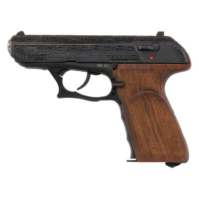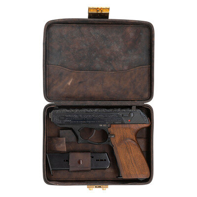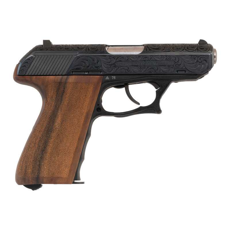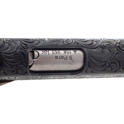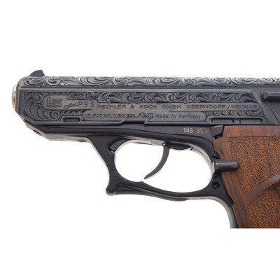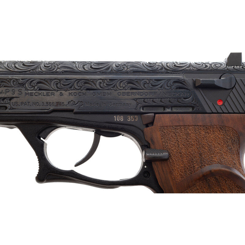 9mm Para. 4" barrel length. SN: 108350. Blued metal finish with black synthetic triggerguard, textured one-piece walnut grips, polished barrel, and engraved slide. Roller-delayed blowback operated DA/SA internal hammer fired autoloading pistol fed by detachable single-stack magazines. Engraving to the slide consists of an Arabesque pattern bordering the make and model markings on the flanks, and flowing along the top of the slide. Item features polygonal rifling and a cocking lever on the left frame, and a slide mounted safety. Left slide is marked HK Mod. P9S HECKLER & KOCH GMBH OBERNDORF/NECKAR/US. PAT. NO. 3.566.745 Made in Germany. Right displays the importer marking excL for SACO Arl. Va. 22 209. Right frame displays the date marking of 76. Pistol mounts high profile sights with red highlights to rear sight and white highlight to front sight. Comes in a leather presentation case with HK in gold lettering to the lid, and a brass lock plate. Included with the pistol are two magazines.