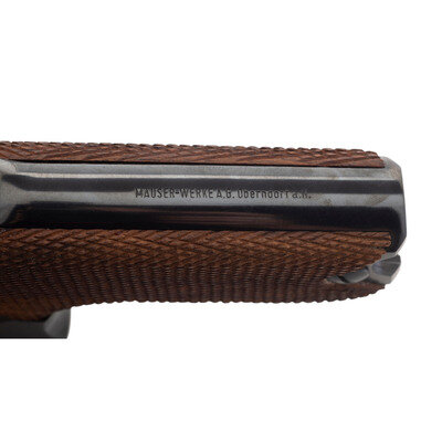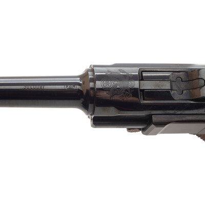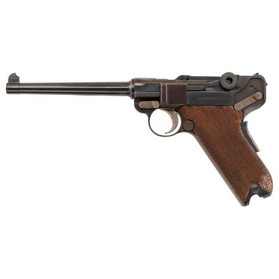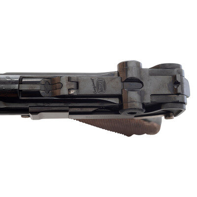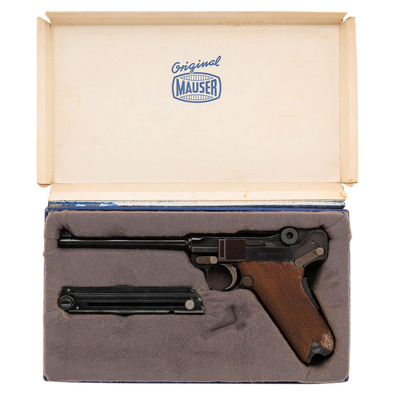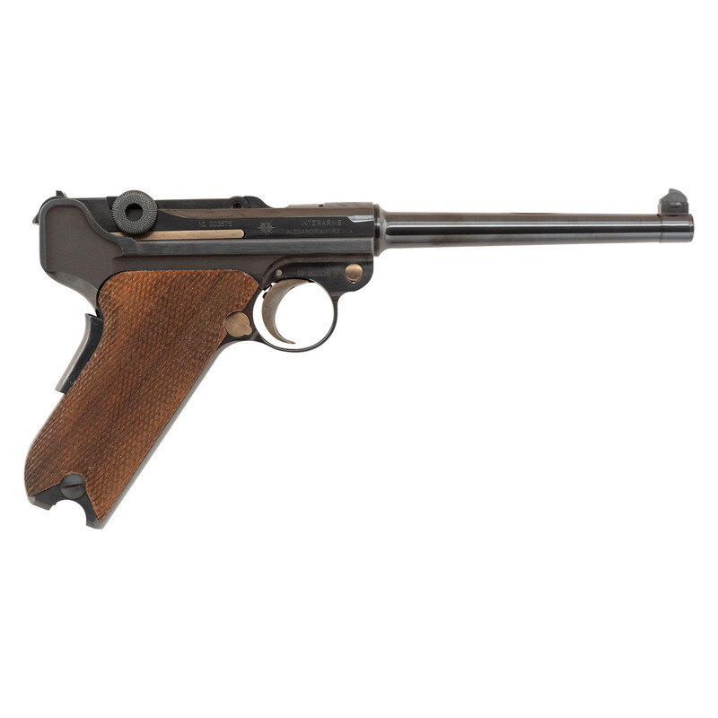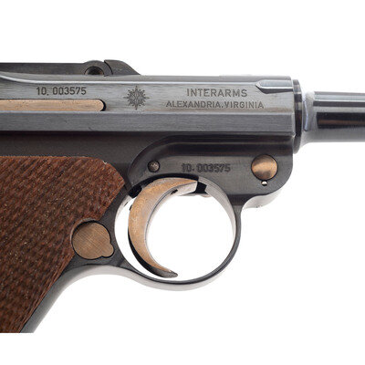 7.65x21 (.30 Luger). 6" tapered barrel. SN: 10.003575. Blued finish, strawed small parts, checkered hardwood grips. Semi-automatic toggle action magazine fed pistol with grip and thumb safeties, fixed rear sight and dovetailed blade front sight. Top of chamber with {American Eagle} marking, top of barrel marked .30 LUGER. Top of toggle marked Original over the {Mauser Banner}. Left side of frame marked MAUSER PARABELLUM, right side with Interarms markings. A single magazine is included. The pistol is contained in its Interarms factory box which is appropriately marked to the gun on the end labels. The takedown tool is missing from the box.