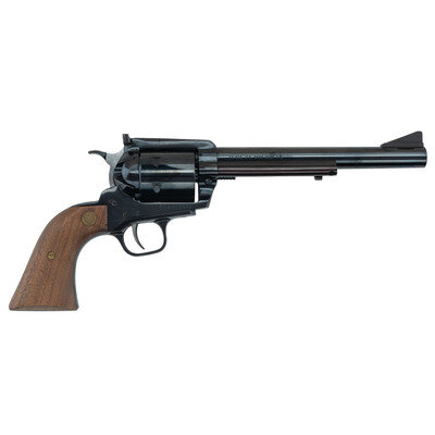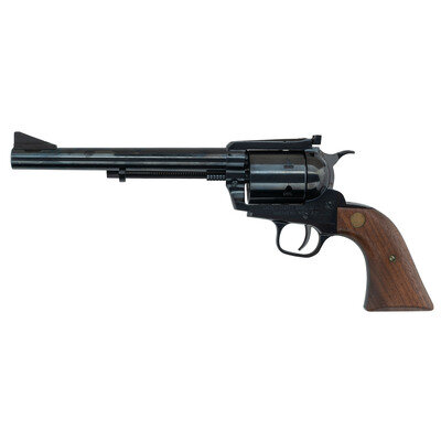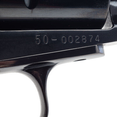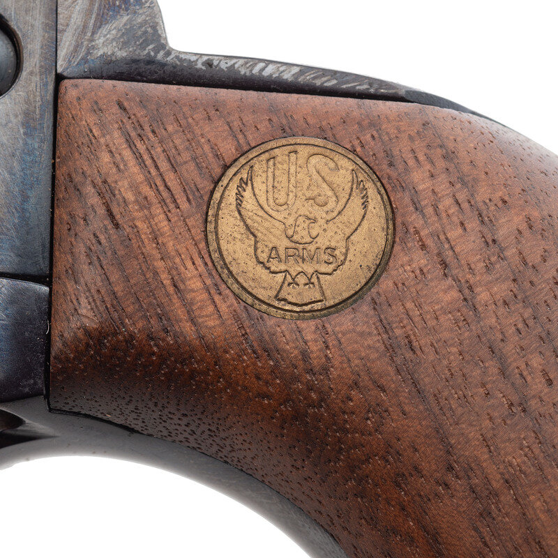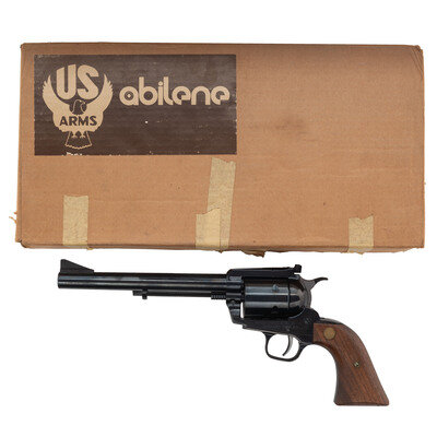 .44 Magnum. 7.5" barrel length. SN: 50-002874. Blued metal finish with plum blued ejector rod housing, polished hammer flanks, and mounting smooth two-piece walnut grips with US/ARMS medallions. Single-action six-shot loading gate revolver mounting topstrap notch and matted front ramp sights with a ported muzzle. Item mounts a round barrel, wide serrated trigger, and a wide knurled hammer. The left frame is marked UNITED STATES ARMS .44 MAG./RIVERHEAD NY ABILENE, while the right barrel is struck 44 MAG. U.S. ARMS CORP. N.Y. Comes in a cardboard box with the US Arms logo and model name on the exterior lid. Serial number on the cylinder matches the frame.