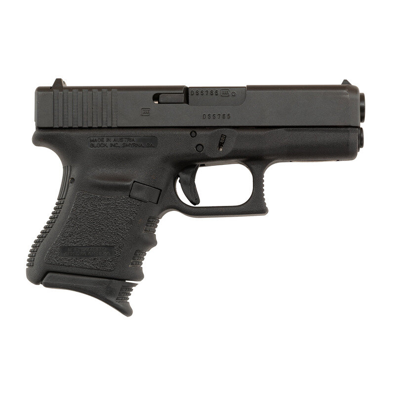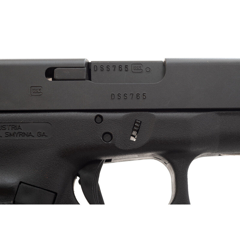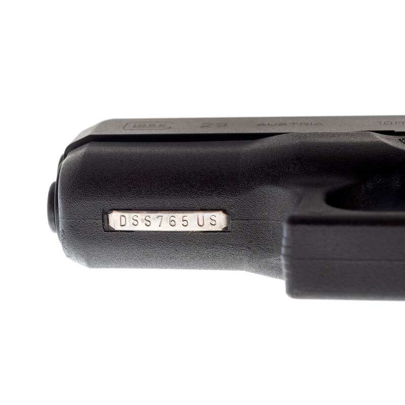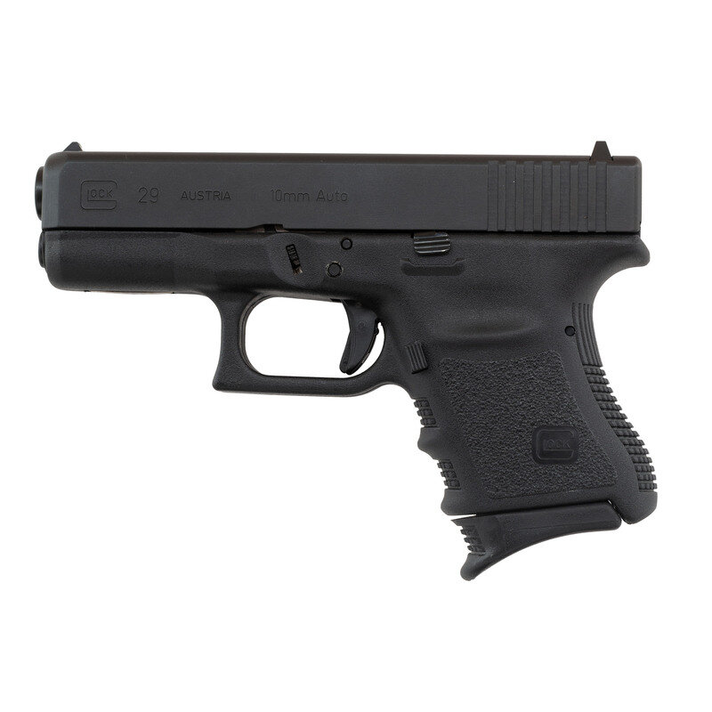 10mm Auto. 3.77" barrel length. SN: DSS765US. Black finish to all metal parts with black synthetic non-railed frame with finger grooves. Short recoil operated striker action autoloading pistol fed by detachable box magazines. Item shows standard make and model markings, including MADE IN AUSTRIA mark on the frame. Comes in a black synthetic Glock "Tupperware" style hard case with an unopened owner's manual packet and a nylon bore brush. Comes with one magazine with grip extension floorplate, and a magazine loading tool.