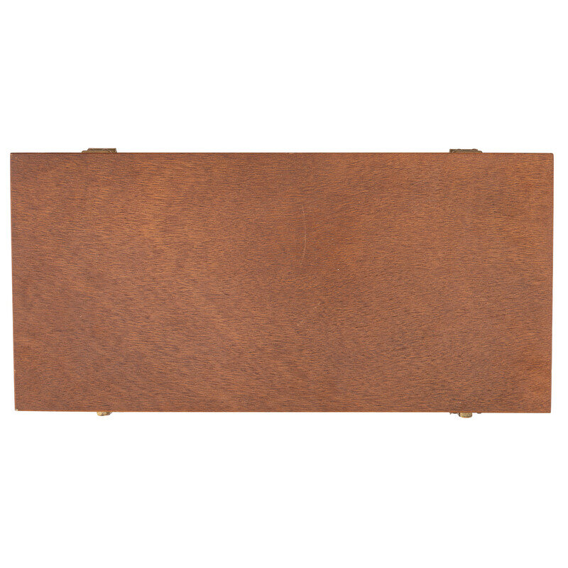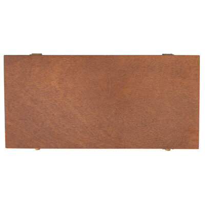 18.25"x8.75"x3" wood shotgun 12 Gauge maintenance case with the inner lid displaying the manufacturer tag LIGHTWOOD/BRITANNIA ROAD,/BANBURY,/OXFORDSHIRE. Box contains a two-piece wood cleaning rod, nylon bore brush, two brass bore brushes, brass jags, two wool bore mops, package of flannelette patches, bottle of NEVA RUST with Lightwood logos, micro fiber cloth, bottle of RANGOON OIL with Lightwood logos, and two nickel plated oilers with each base stamped LIGHTWOOD/MADE IN ENGLAND.
