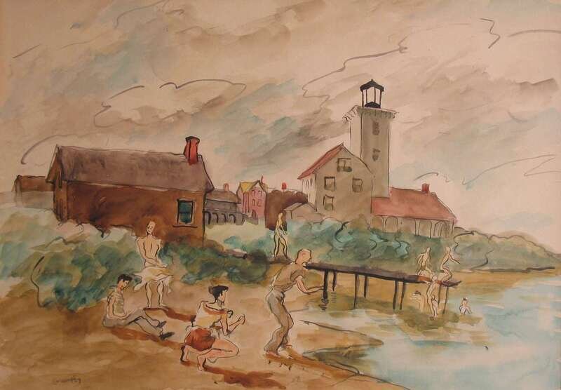 WALTER STUEMPFIG JR. (AMERICAN 1914-1970) ON THE SHORE BY THE LIGHTHOUSE