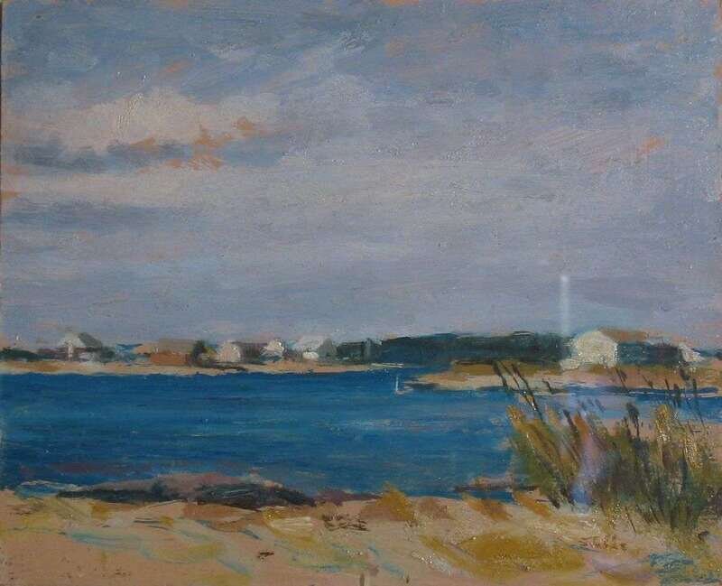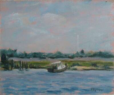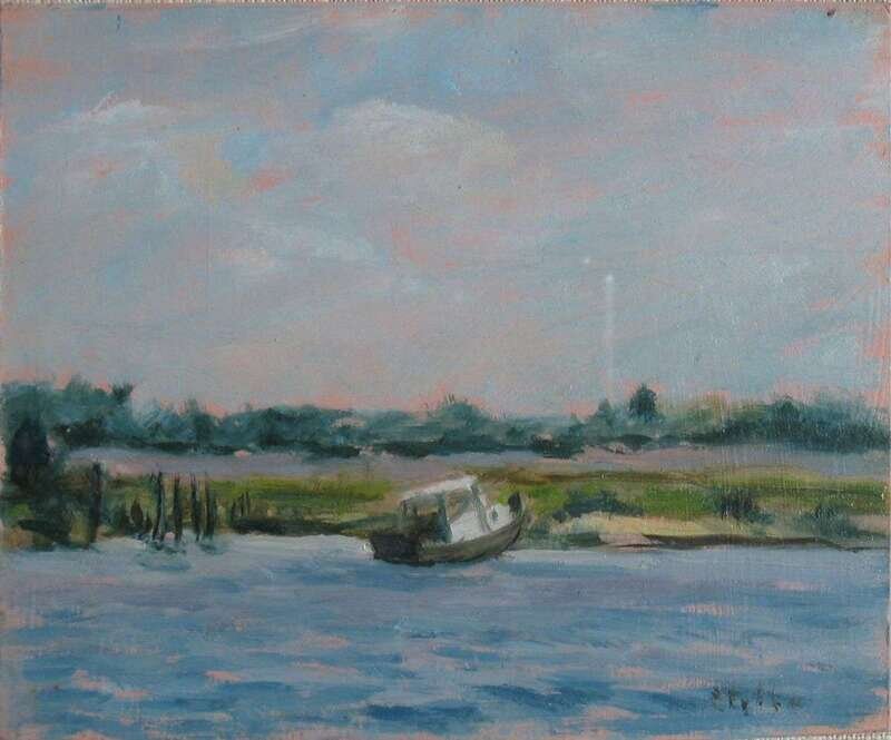 MARIE STOBBE (AMERICAN 1909 - 2003)PAIR OF OILS VIEW WITH RIVER AND HOUSES