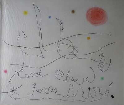 1964, edition of 75. Color drypoint. Maeght, publisher and printer. Framed with justification page, pencil signed by Miro and Rene Char, verso.